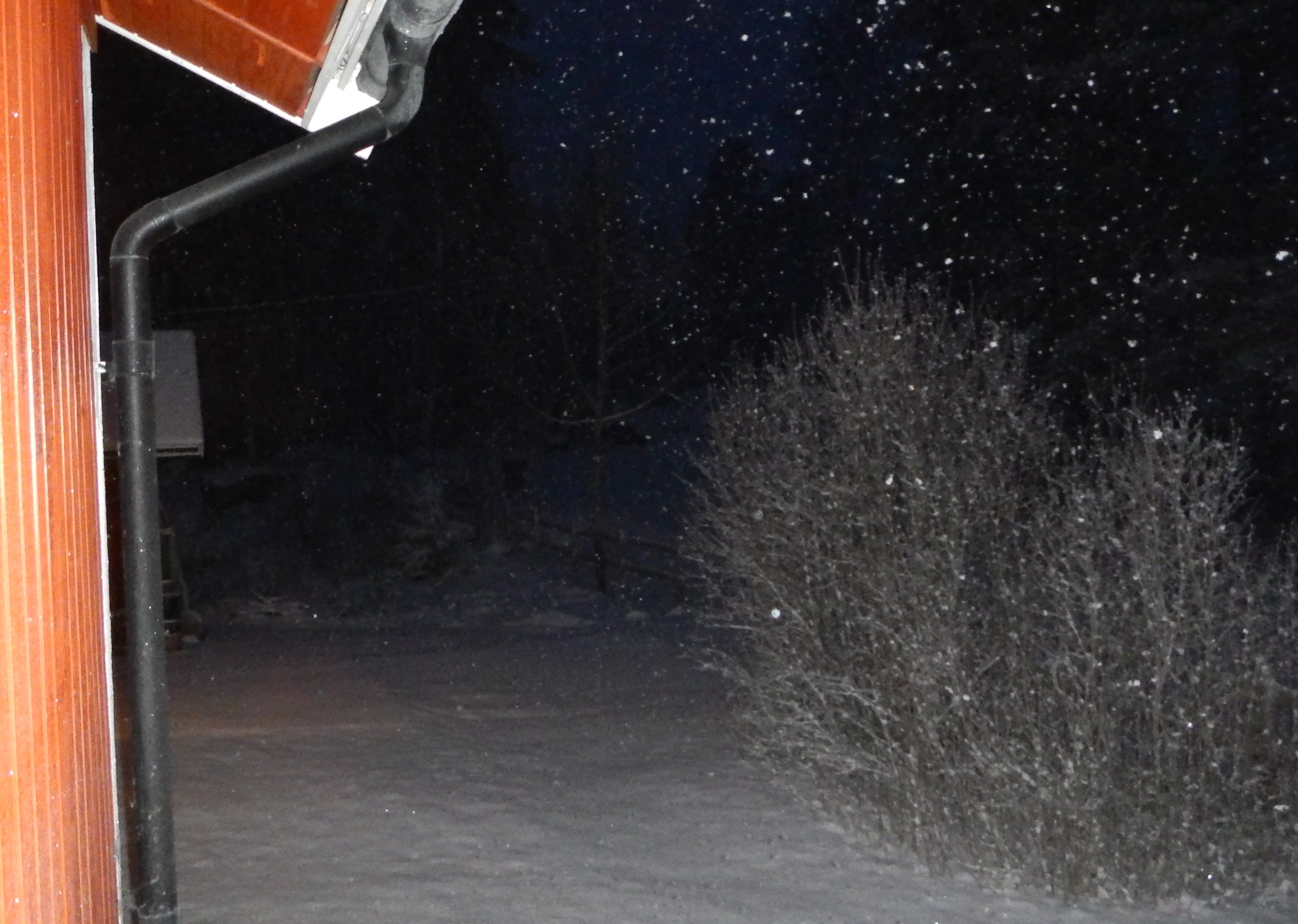 Det blev ganska snabbt snöyra som gjorde sikten på vägen ganska dimmig. Ovana av vinterkörning gjorde att de flesta bilar ville köra i mitten av vägen. Väl hemma var Rolf igång med att skotta och det tog sin tid. Det lär väl bli snö i morgon också antar att det är den norska orkanen Nina som kommer. Tog i alla fall ett foto vid husknuten.