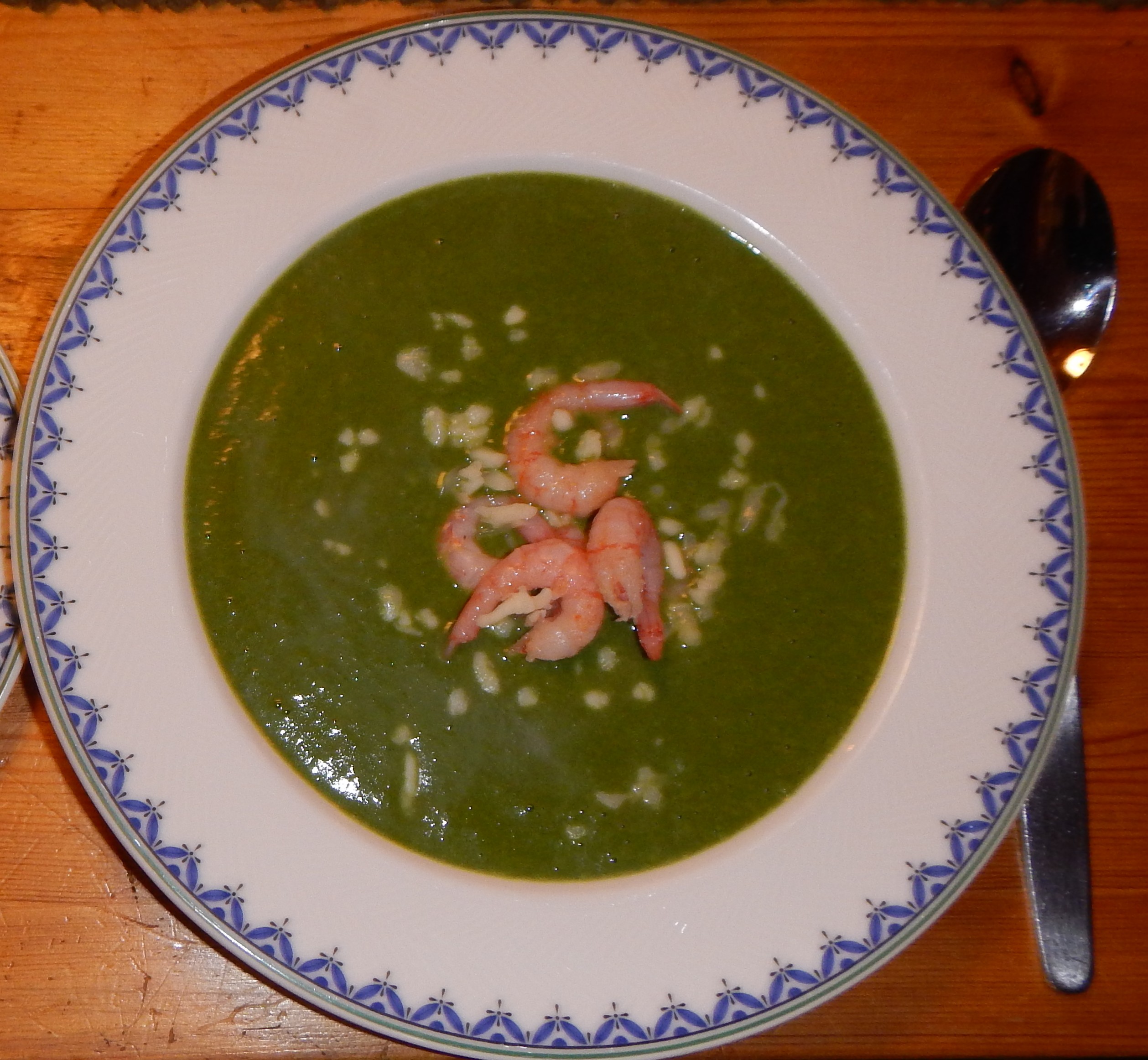 Skala o skiva 1 stor gul lök och 1 stor potatis. Skär 250 gram broccoli i bitar (hela broccolin). Koka upp 1 dl vatten med 2 buljongtärningar, lägg i grönsakerna och koka det i 10 minuter. Mixa det sedan med en stavmixer eller matberedare. Smaka av med salt o peppar. Tillsätt 1 dl vispgrädde och låt koka upp innan servering. Soppan kan lagas i god tid och bara värmas tillsammans med grädde. För att göra det festligare kan man lägga i, brödkrutonger, flagad parmesan, räkor, ja vad man känner för. Väldigt god och lättgjord soppa.