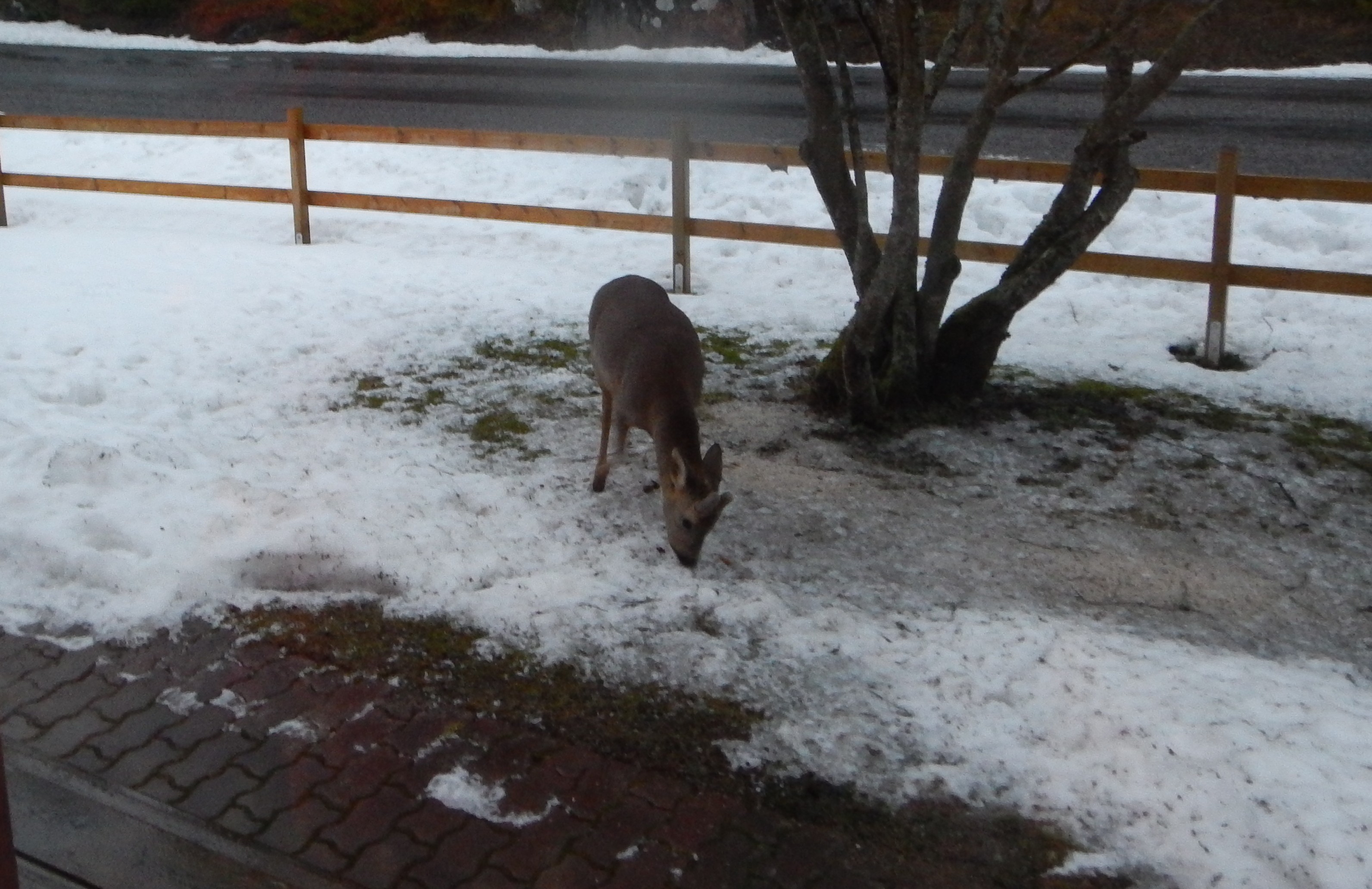 De gick ända fram till ytterdörren för att kolla om det fanns något kvar av fågelmaten. Det kan man kalla modiga rådjur när det bor en snabb jakthund i huset och därtill låg han precis innanför ytterdörren. Ni kan tro att han ylade när han kom ut och detta gjorde han stående på bakbenen. Men då hade dessvärre rådjuren redan gått.
