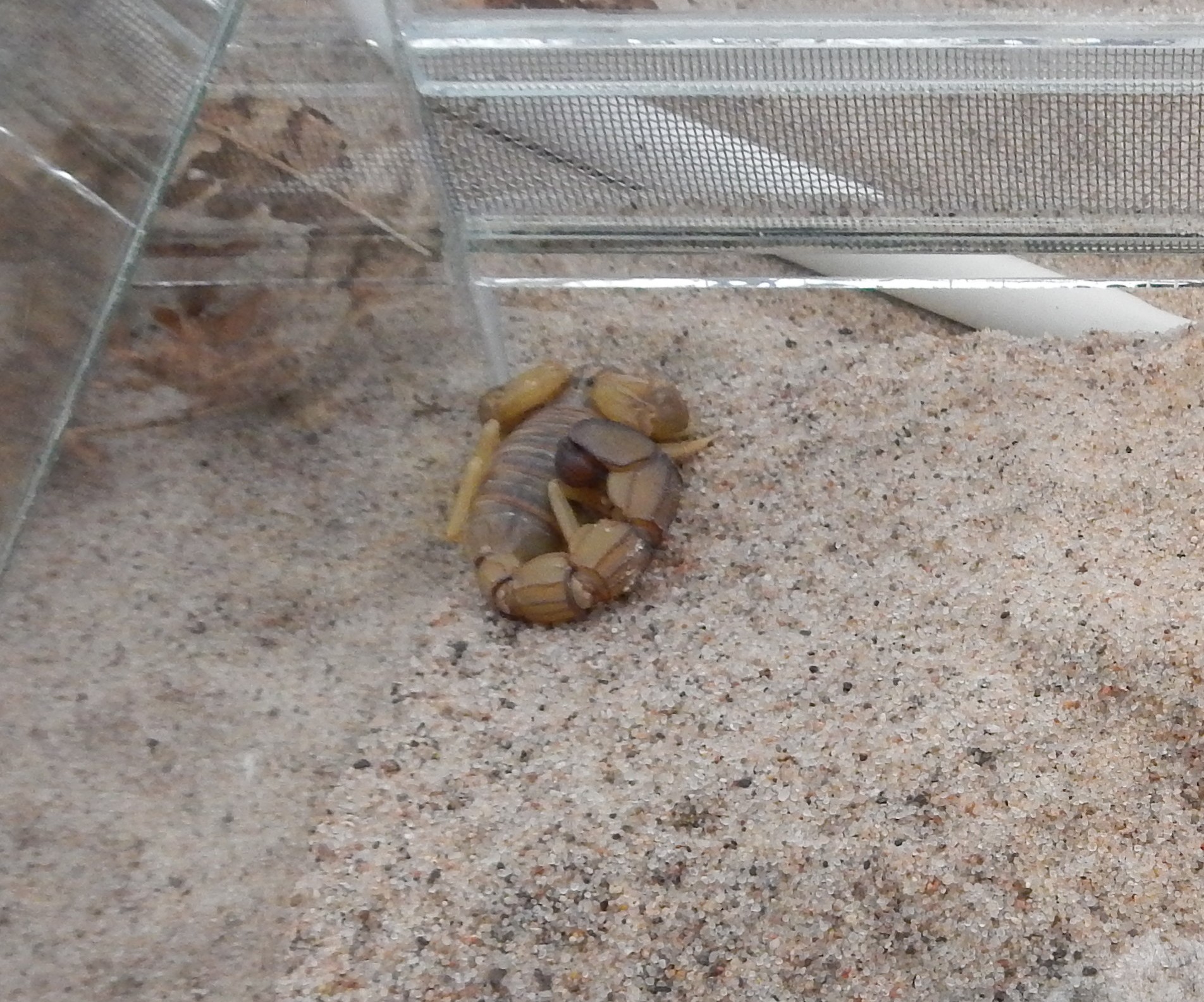 På fotot nedan ligger en annan sötnos en Nordafrikansk tjocksvansskorpion en av världens giftigaste skorpioner. Kan bli drygt 10 cm lång och dess färg gör att den lätt kan gömma sig i sanden. Bor i små hålor eller under stenar av någon anledning finns den inte nära kusterna (gillar väl inte vatten). Finns i Nordafrika, mellanöstern och Indien. Vare sig söt eller trevlig.
