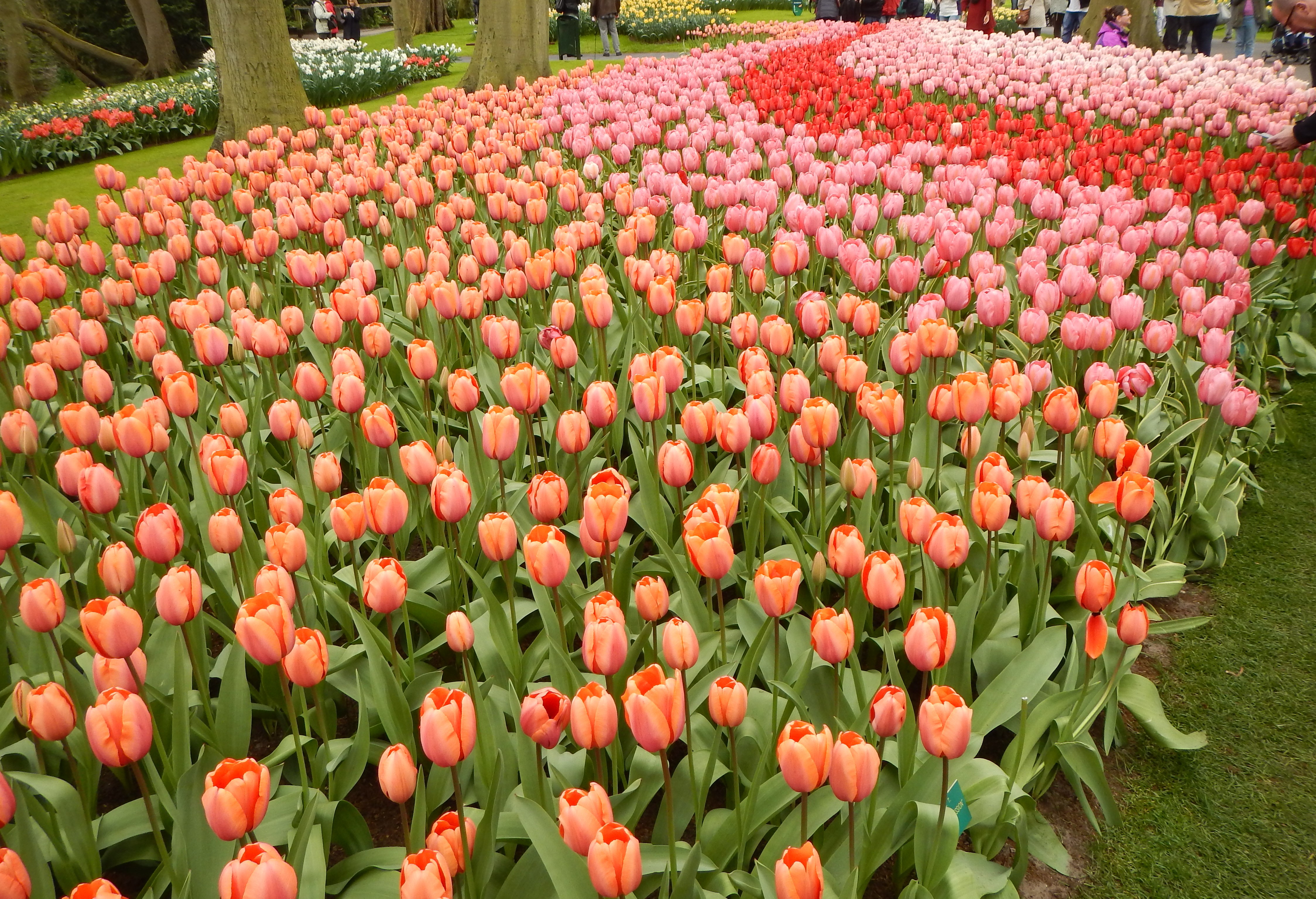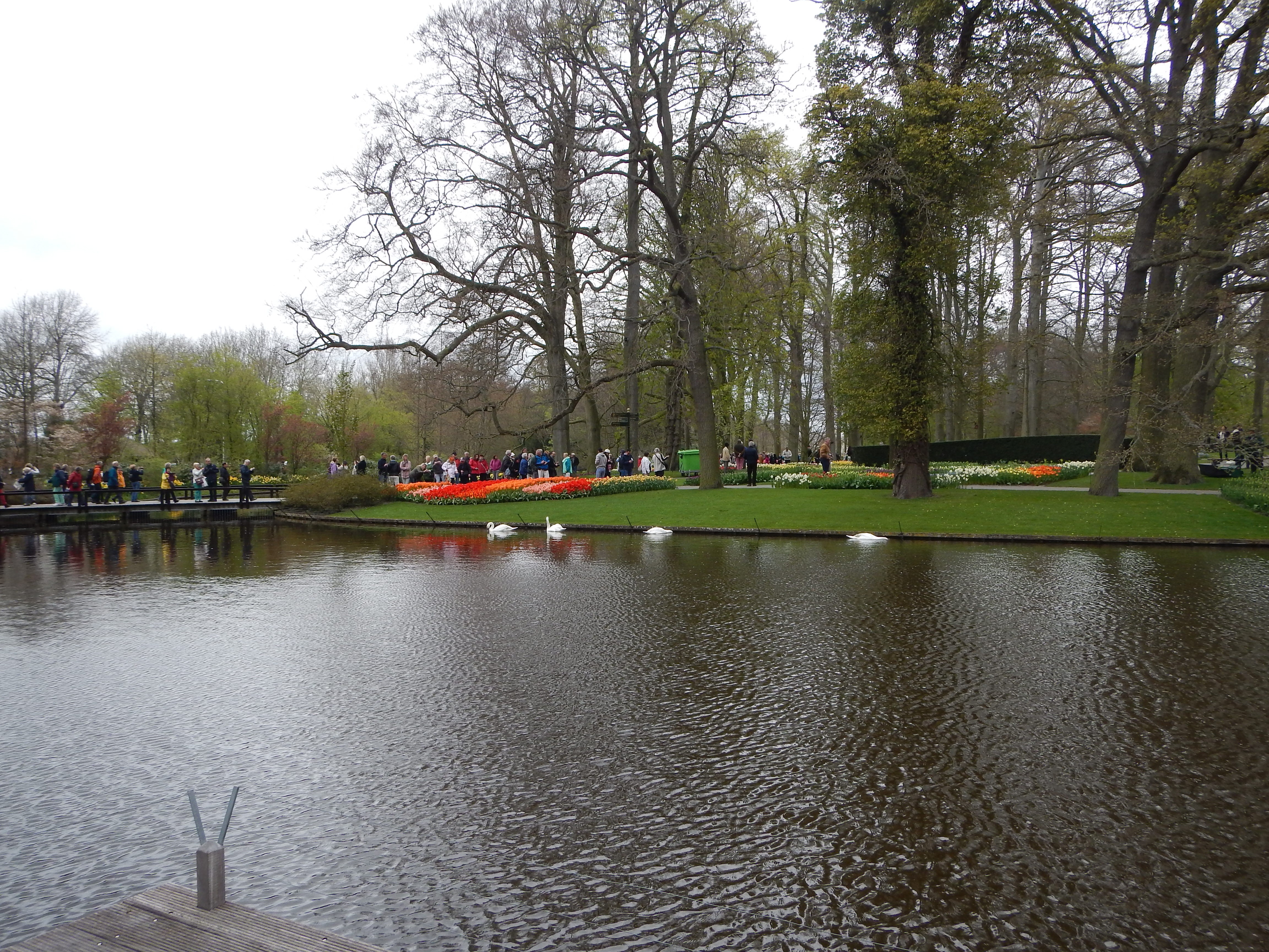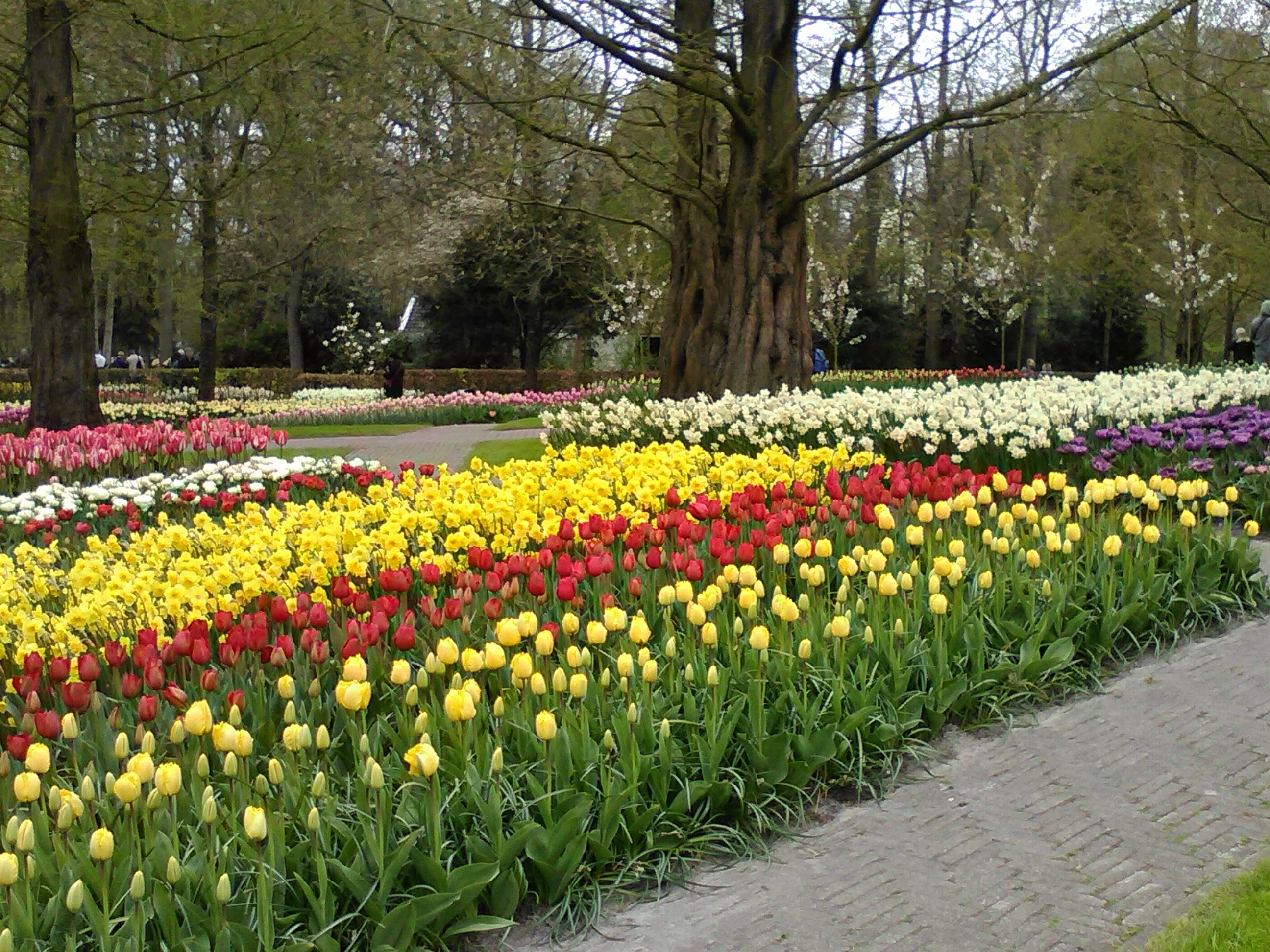 Att åka till Holland och titta på tulpaner är en resa man ofta skämtar om som pensionärsaktivitet. Vi har tidigare pratat om att ta denna tripp men aldrig kommit oss för. Nu är det i alla fall gjort, vi var en grupp på nio personer som känner varandra sedan länge som åkte iväg. Nu kan jag konstatera att Keukenhof med sina tulpaner är en plats för alla åldrar och en dag kan man definitivt spendera där om man vill se hela parken i lugn och ro. Det är väldigt lätt att missa en del, det är inta bara tulpaner det handlar om. Förutom en fantastisk parkanläggning, finns där fyra paviljonger som var och en har en speciell inriktning. Här nedan syns ett fåtal av alla rabatter som finns efter gångvägarna. Jag imponerades av träden med sina enorma stammar men vet dessvärre inte vad de heter.