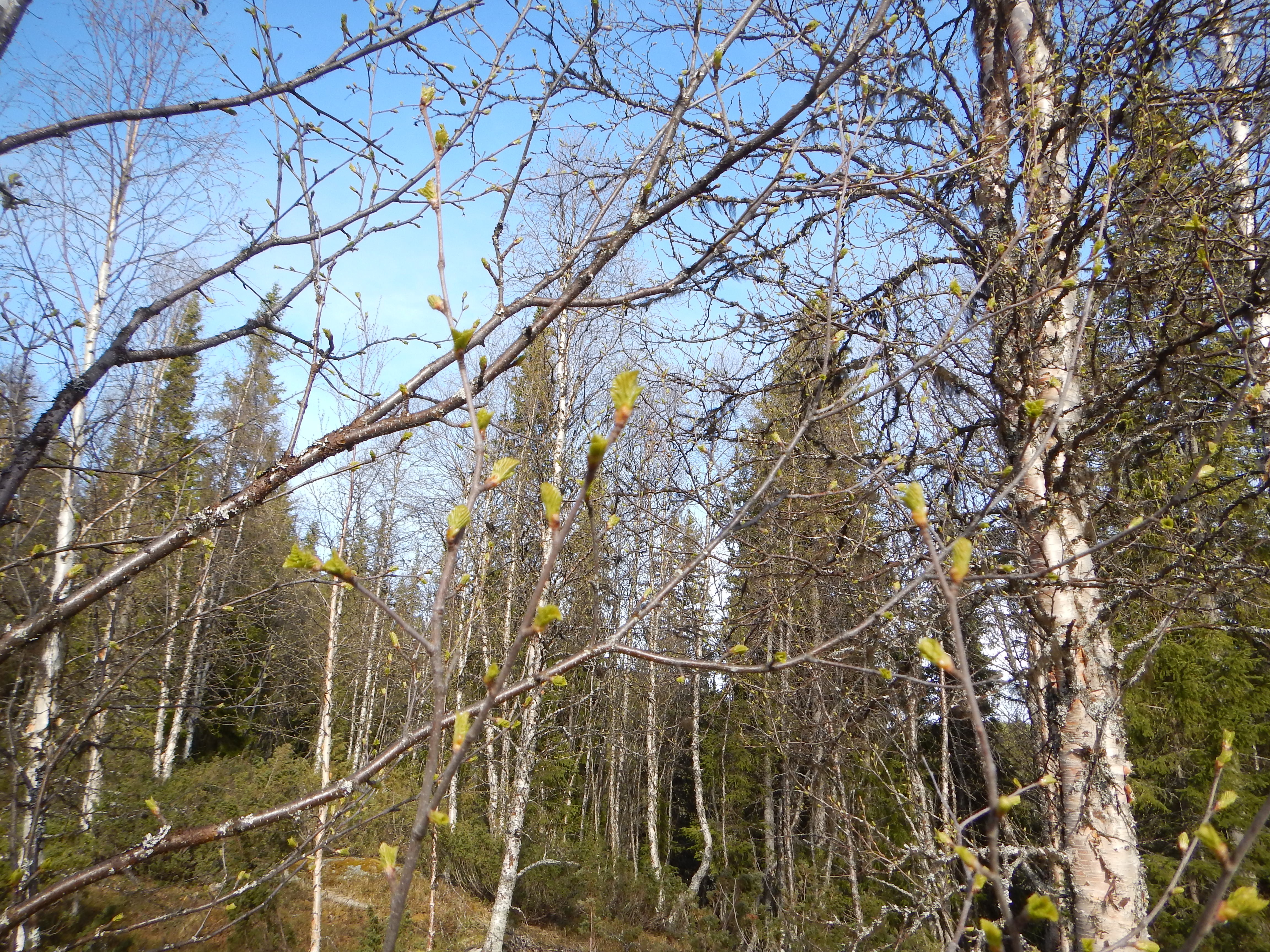 Så här ser det ut hos oss just nu, björkarna börjar få ”musöron” och snart kommer de att bli lite gröna.