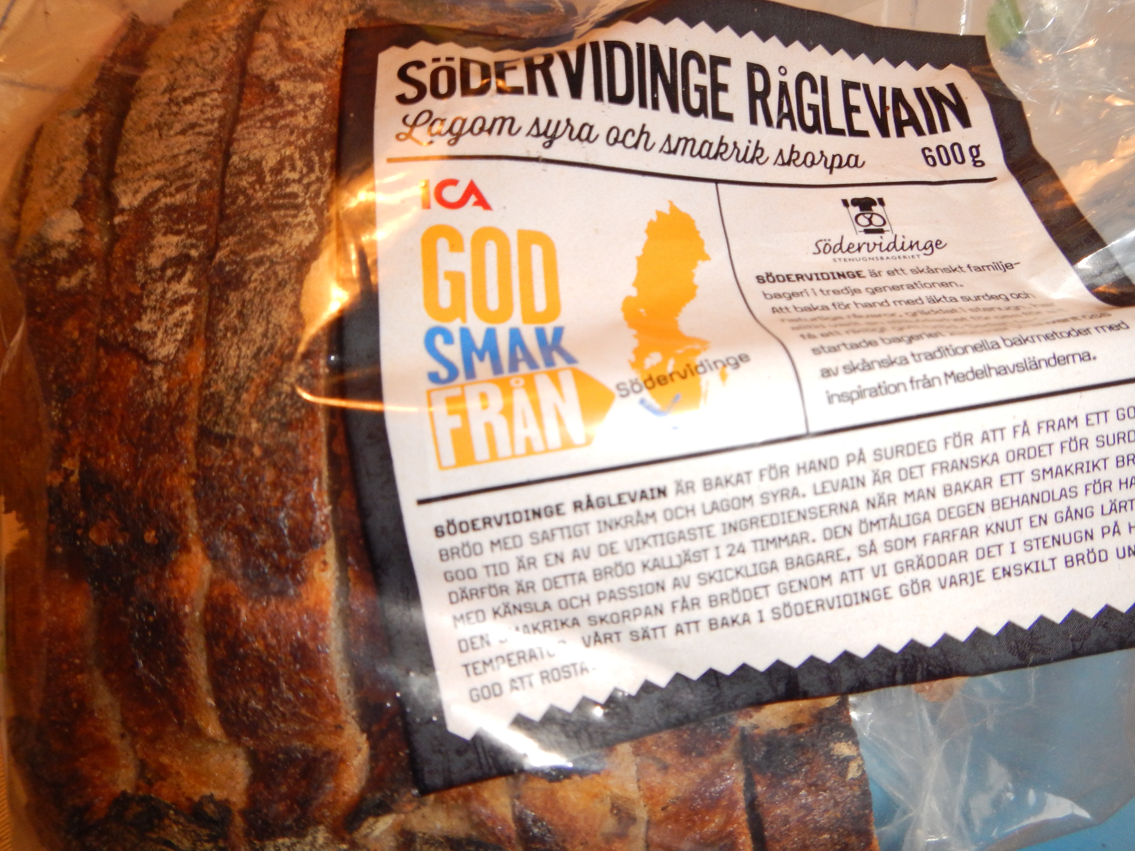 I samma affär hittade jag ett matbröd. Ett surdegsbröd från Södervidinge i södra Skåne, det heter Råglevain? Bageriet är ett litet familjeföretag som nu är inne på tredje generationen och det startade någon gång runt 1965. Här var det en kort lista vad gäller ingredienser och givetvis inget konserveringsmedel.