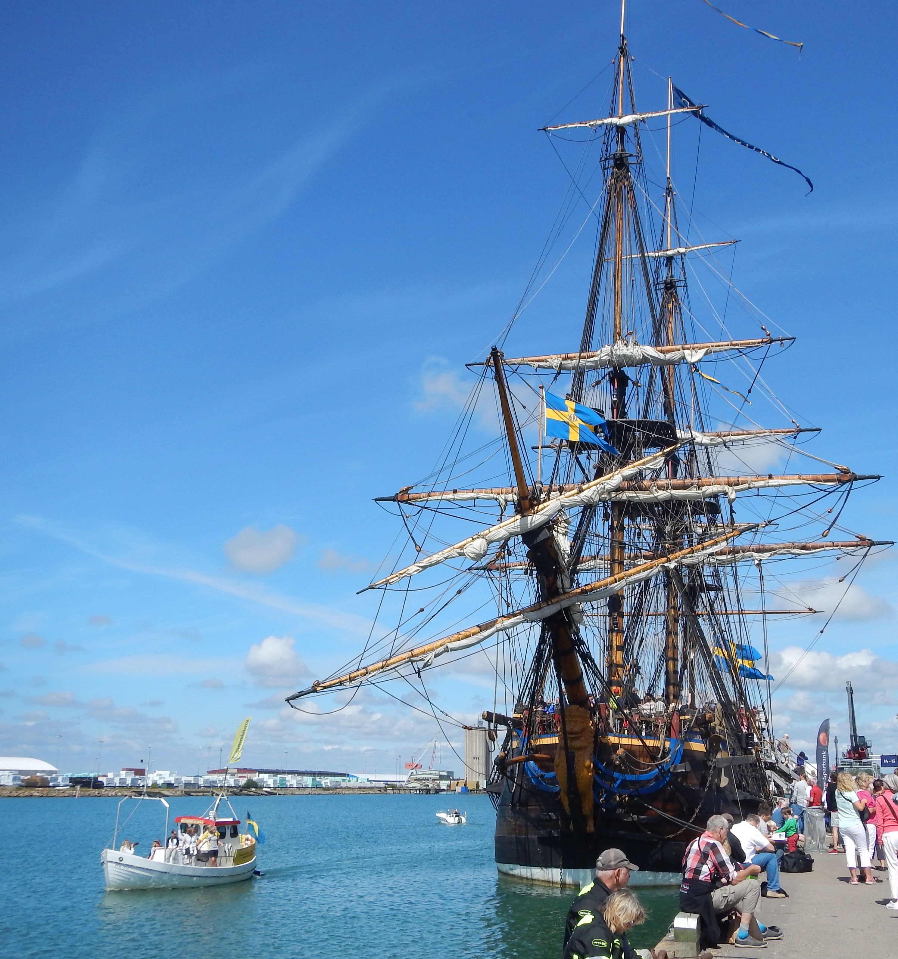 DSCN3196.JPG1 Skeppet är 68 meter långt och 11 meter brett och har en besättning på cirka 80 man. Vi väntade till eftermiddagen med att se på det eftersom vi befarade att det annars skulle vara så mycket folk. Mycket folk var det hela tiden och man beräknade att minst 5 000 personer skulle ta chansen att se det även på insidan. Minst dubbelt så många stod vid kaj eller befanns sig i småbåtar runtomkring. När det lättar ankar i Varbergs hamn styr det stäven mot Tyskland. Usch vad det är svårt med alla dessa historiska minnesmärken av alla de slag, nu måste jag skaffa en bok och läsa in mig på historien kring moderfartyget. Det är svårt när man är nyfiken men så var ju detta en sevärdhet som heter duga.