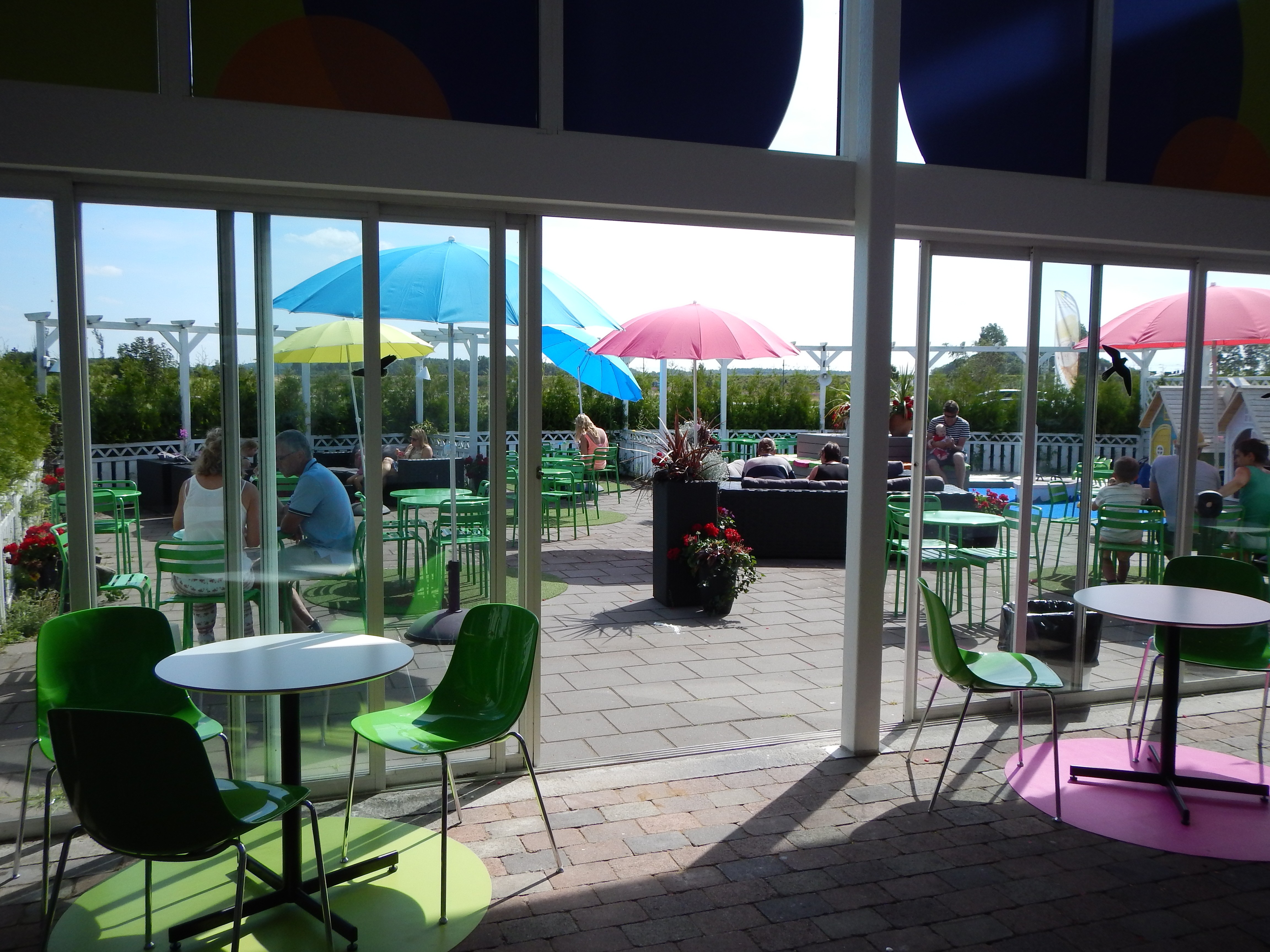 På ena gaveln ligger ingången till deras glasscafé och där kan man välja på en massa olika smaker. För egen del tog jag en bägare med Lemoncurd och Hjortronglass, Rolf tog gammaldags vanilj och vit chokladglass. Dessa smaskade vi i oss sittande under ett parasoll i deras vackra uteveranda.