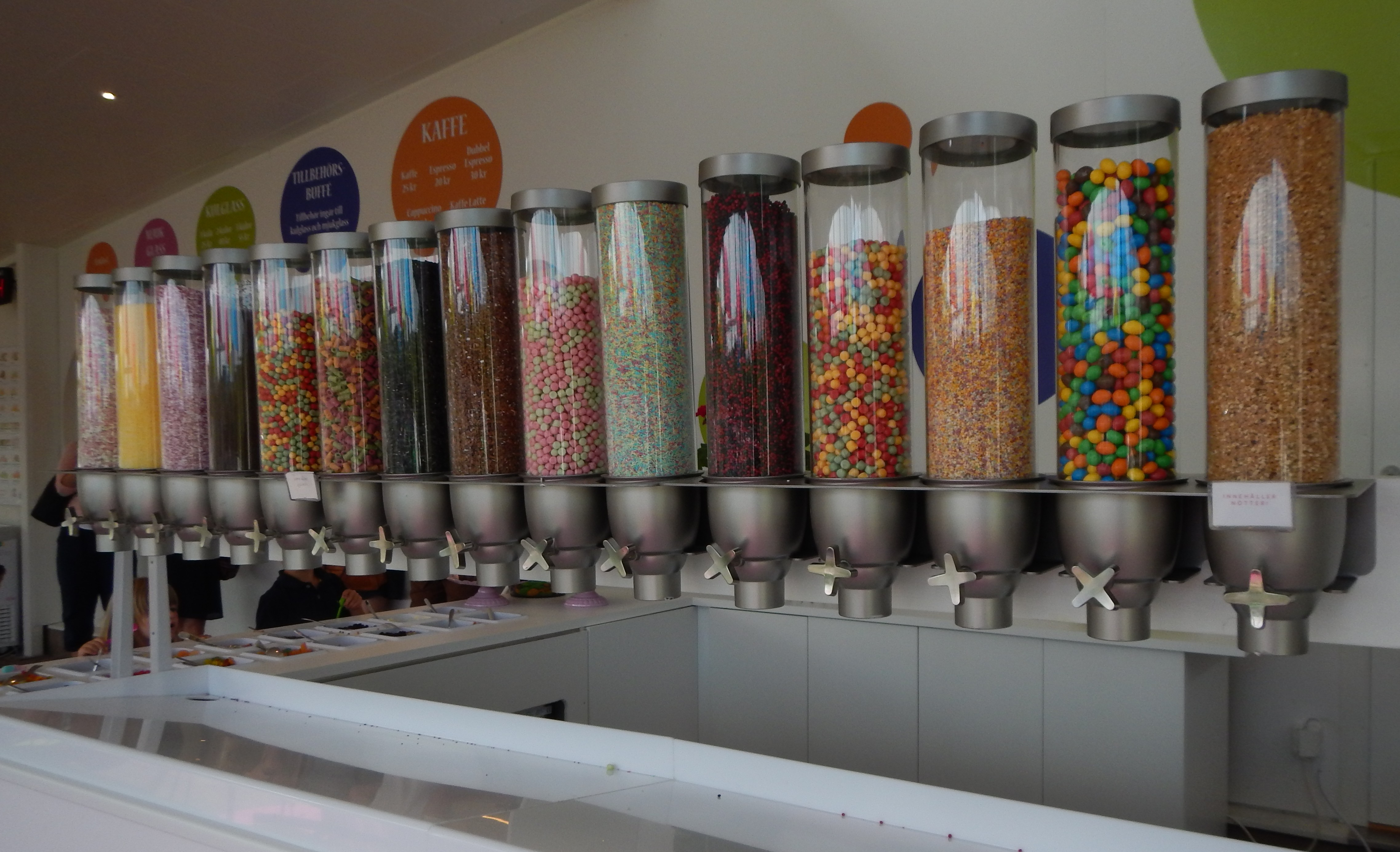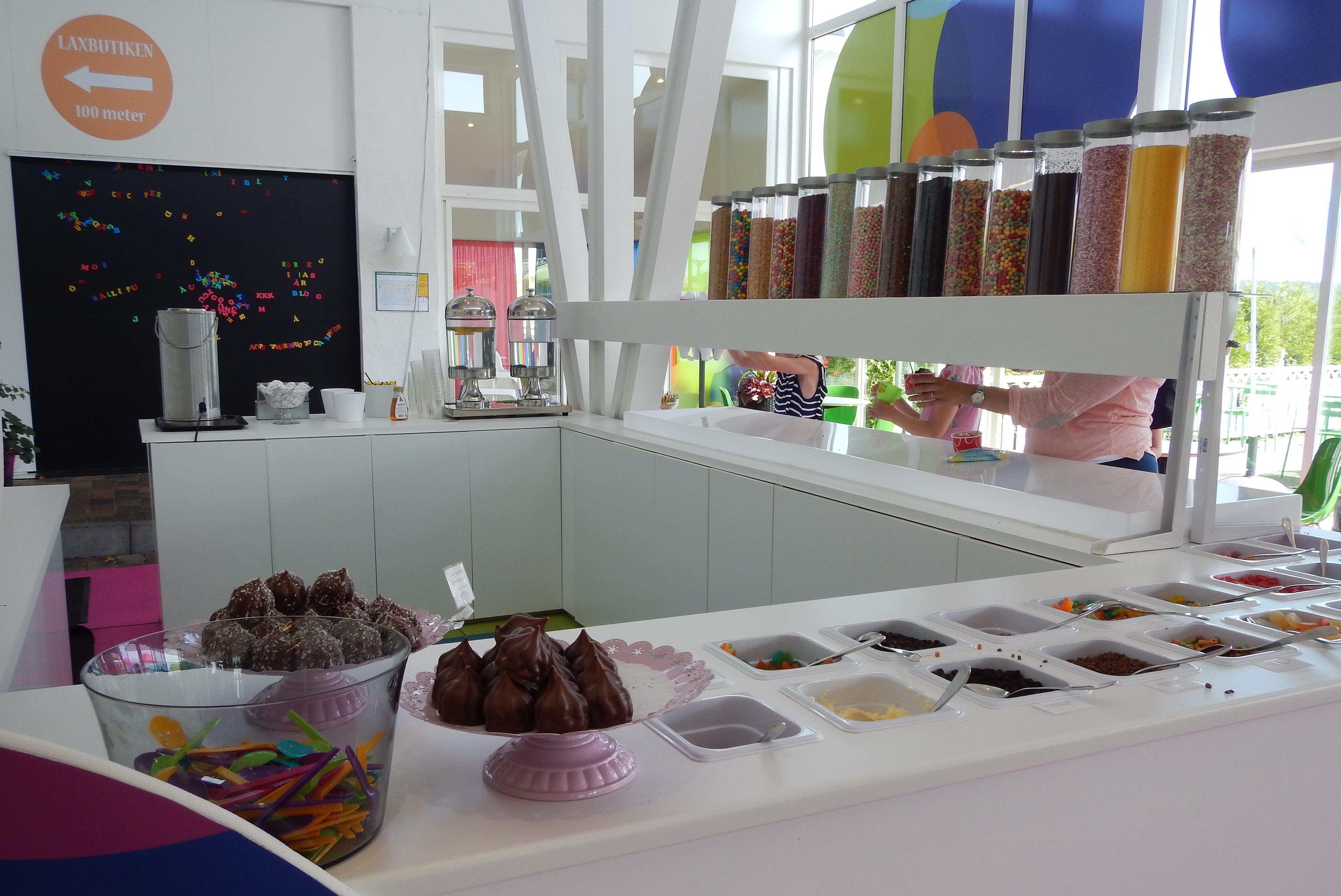 På andra sidan bordet finns det en ställning med ännu mera godis och strössel. Förödande för någon med dålig karaktär vad gäller sötsaker, som jag till exempel och alla vet ju att gratis är gott.