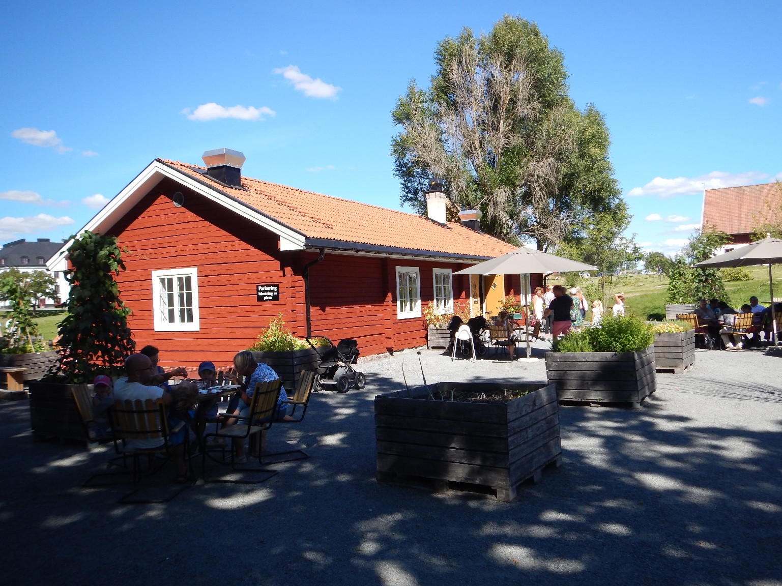 Det är inte bara kulturell och andlig spis som serveras på Wenngarns slott nej du kan njuta av allehanda läckerheter. Det finns naturligtvis en väldigt bra restaurang men då dagen var solig och magen inställd på kakfrossa hoppade vi över restaurangen. Det är klart är man törstig finns det ju ett musteri där man antagligen ta tillvara frukten från alla äppelträden och jag tror även ett ölbryggeri. Detta hus var dock stängt denna dag. För att kunna njuta ordentligt av sötsakerna laddade vi lite med pizza innan. Dammstugans vedugn är namnet på detta charmiga lilla inneställe.
