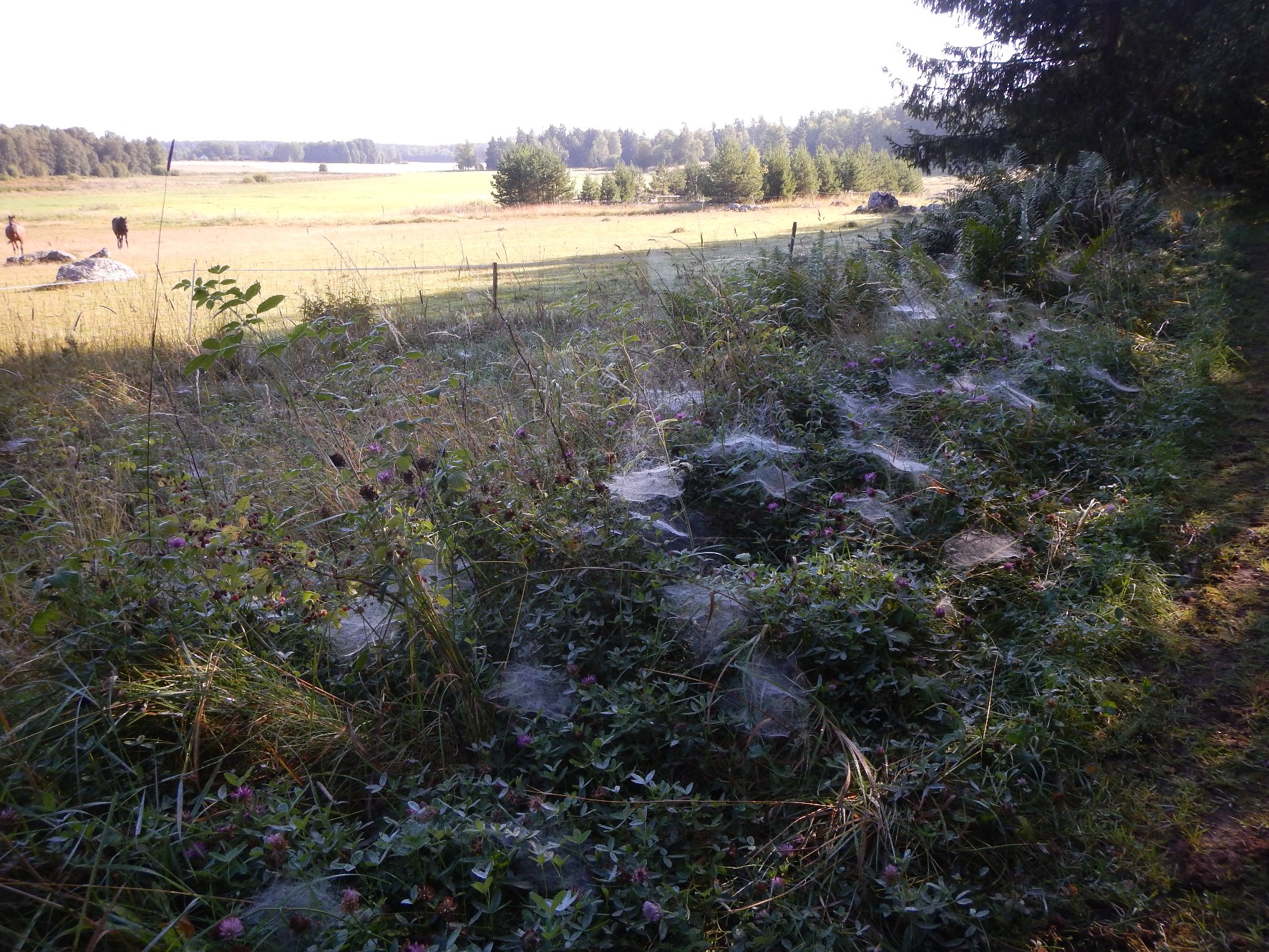 Spindeln var väl 2 – 2,5 cm lång men tillräckligt respektingivande för att jag skulle hålla mig på avstånd. Nästa gång jag gick förbi var allt borta undrar vad som hände? Så mycket olika spindelnät som jag såg längs vägen idag har jag nog aldrig sett förut, den tidiga daggvåta morgonen gjorde att de sågs tydligt.