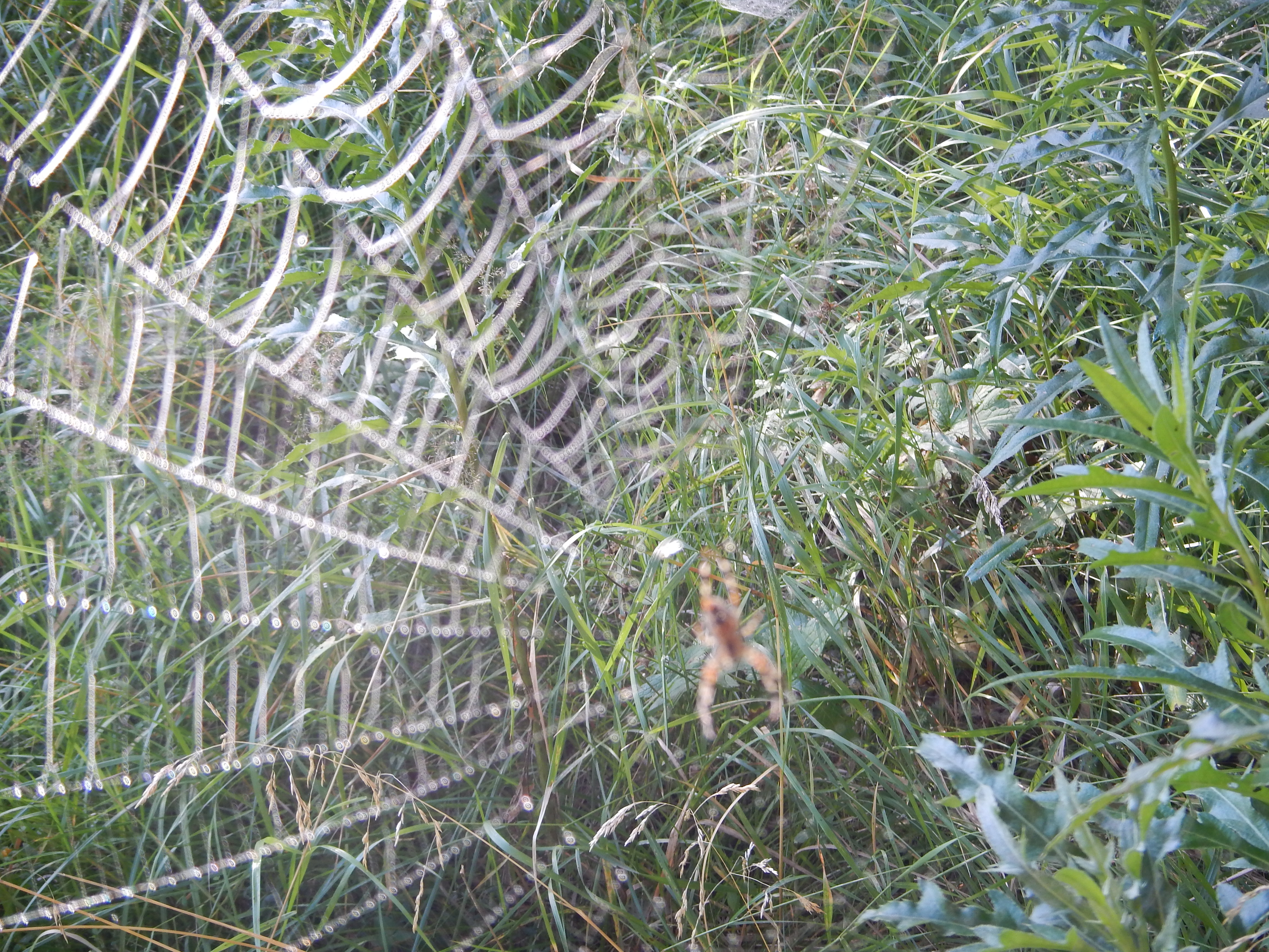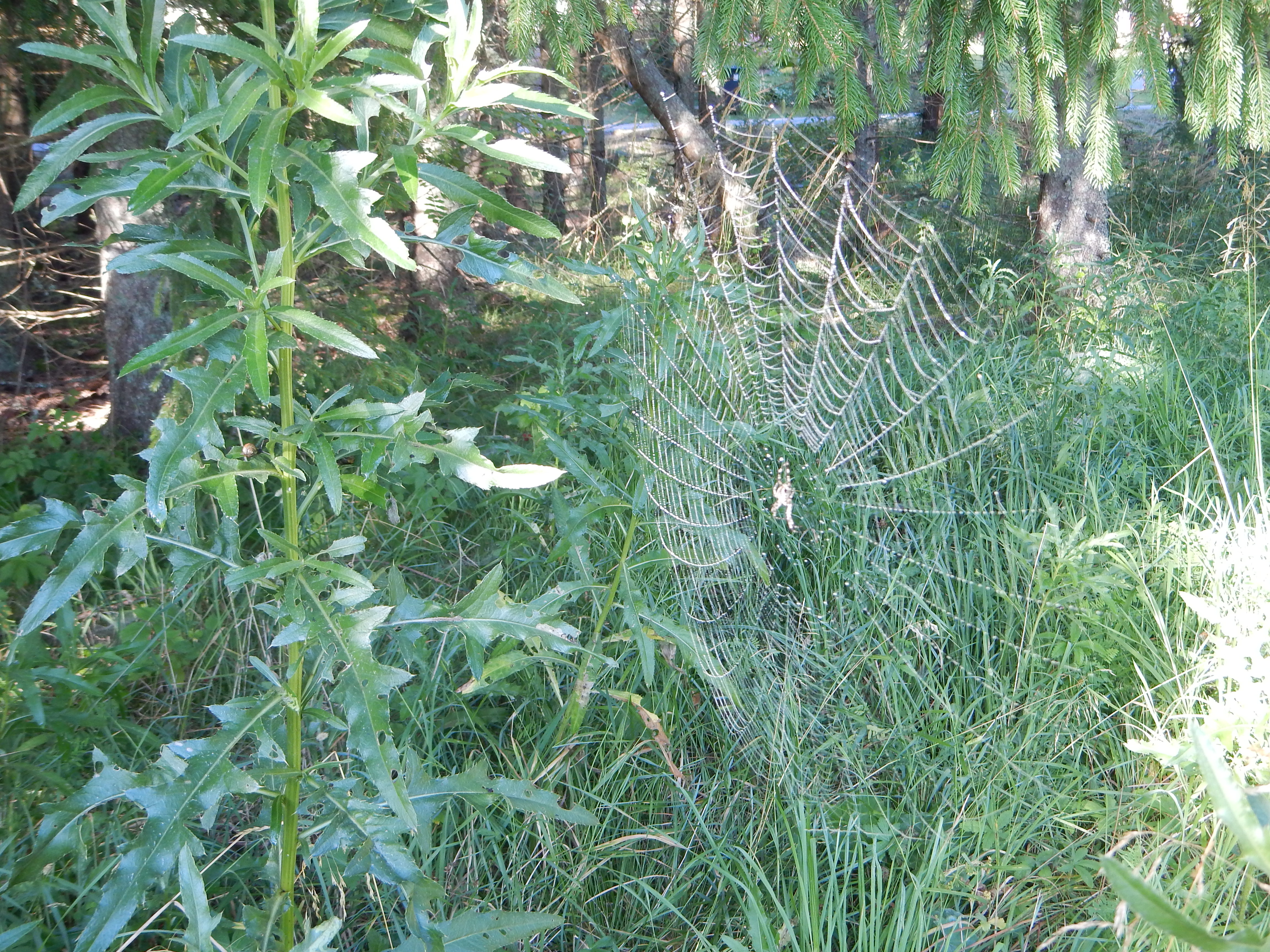 Morgonstund har guld i mund – ett gammalt talesätt och det betyder väl egentligen att ”den som är uppe tidigt får mycket gjort”. Jag motsäger mig inte det fast idag hade det två olika betydelser för min del. Kanske inte för min del snarare en för mig och en för spindeln. Spindlar är djur som jag absolut inte gillar och vill under inga förhållanden ha dem nära mig fast idag var jag tvungen att ta en extra titt. När jag tog en morgonpromenad med hunden fick jag syn på ett fantastiskt spindelnät, blev så imponerad att jag var tvungen att vända och hämta min kamera. Det var så fantastiskt vackert, ett riktigt skolexemplar som bara ser i tecknade filmer. Det var cirka 25 cm i diameter.