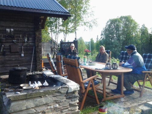 Det krävs en del erfarenhet för att servera en trerätters middag med enkla verktyg. Nyrökt sik, toast med sikröra och sikrom, långstekt älgstek, nyplockade kantareller, hemodlad potatis och sallad, kladdbakelse med passionsgrädde och färska hjortron, vitt vin med hemodlade jordgubbar. Jag behöver väl inte säga att vi var mätta och dessutom njöt av att sitta och följa matlagningen på nära håll. Fast om rätt skall vara rätt damerna stod mest och herrarna satt och pratade jakthistorier, älgjakten närmar sig.