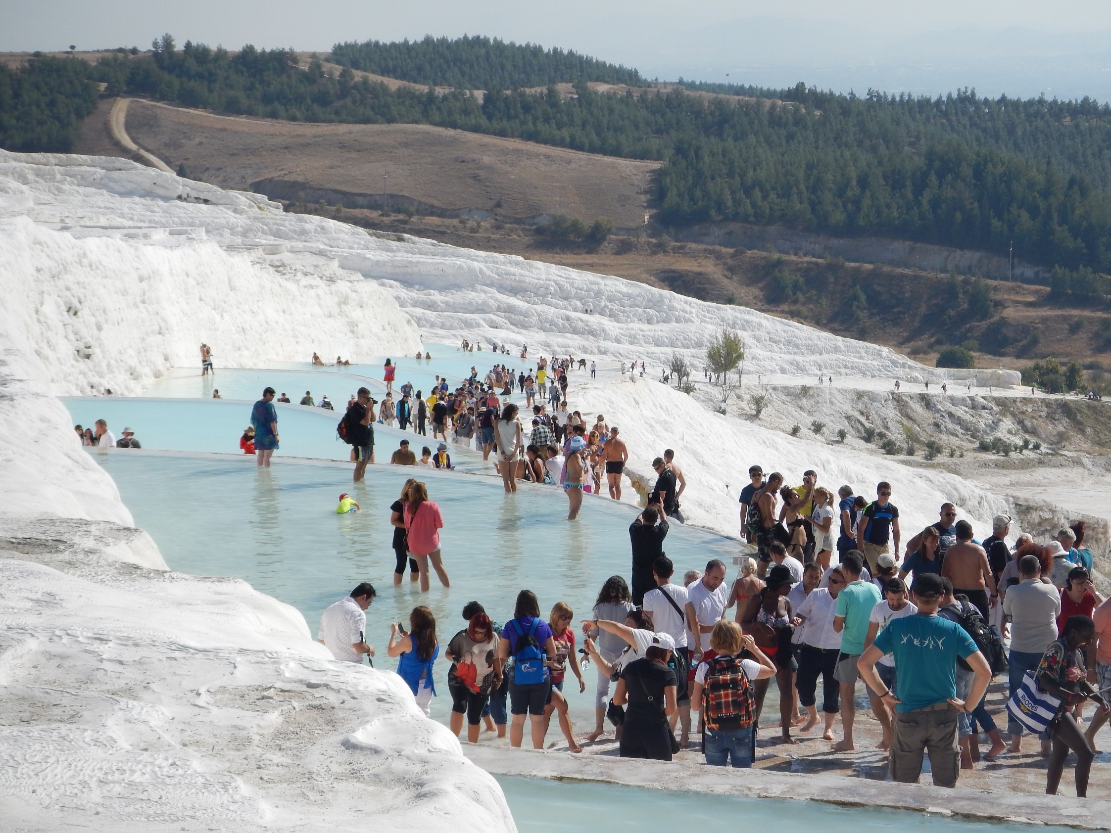 Dags för Pamukkale som betyder bomullsborgen på turkiska, fast jag tycker mer det ser ut som en formation av is och snö. De fantastiska små avsatserna är former som tillkommit genom det kalcium som de varma källorna har lämnat. Denna plats är öppen dygnet runt och det kommer tusentals turister varje dag.