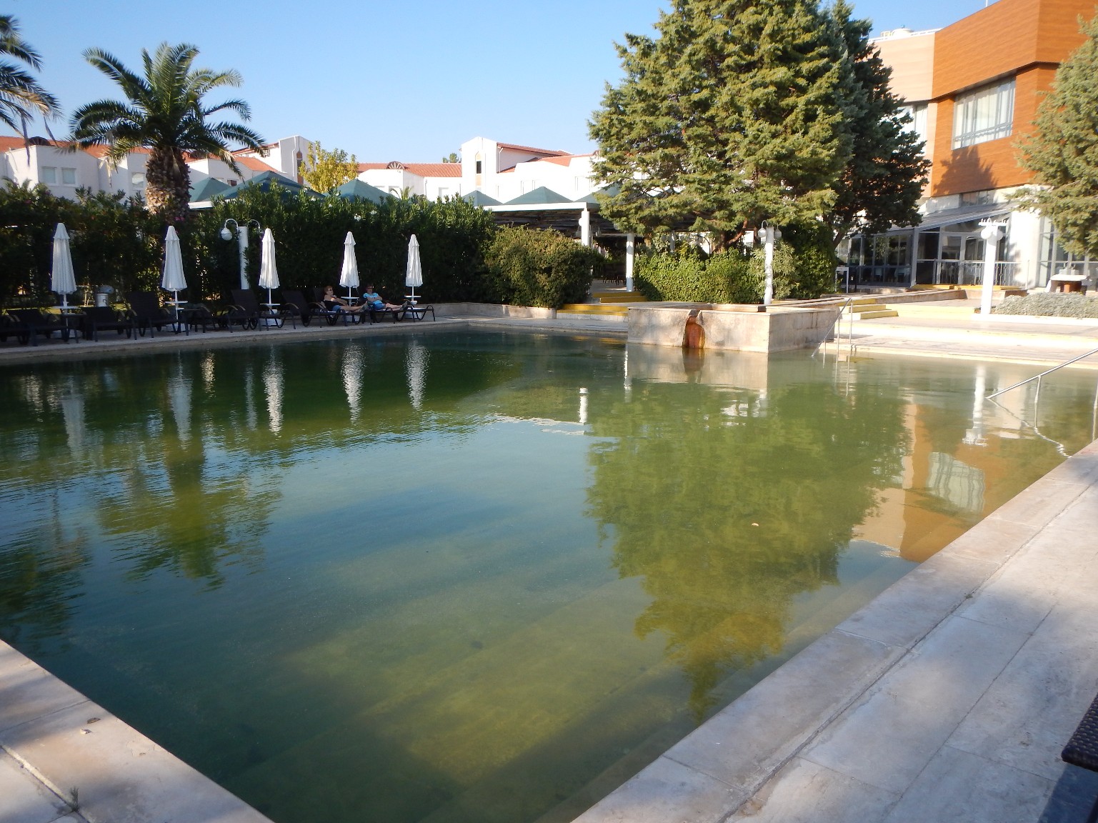 Just den här egendomliga ”stenbilden” på minde mig på något sätt om de uthuggna presidentansiktena i South Dakota, vet inte varför. Efter denna tur tillbaka till hotellet för mera bad, här ses thermalbadet som var ett bad man tog stegvis i tre bassänger varav den varmaste hade en vattentemperatur på 46 grader.