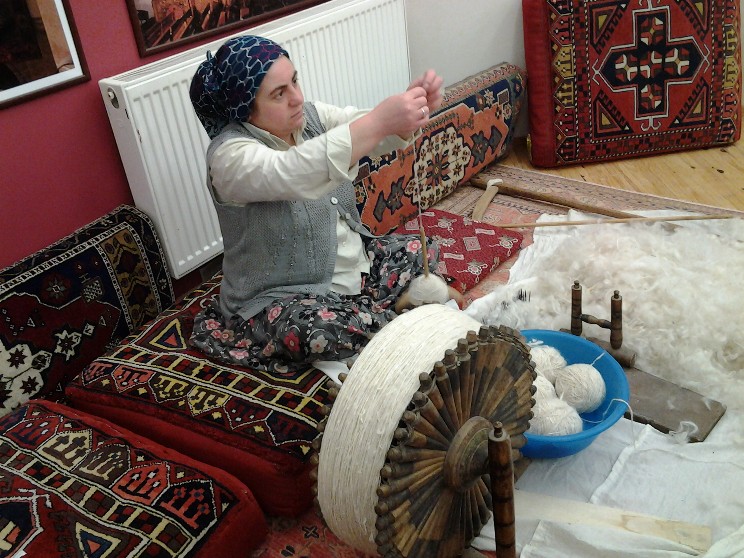 Den här damen spinner trådar av ull och det gick snabbt, antar att det fanns en viss vana.