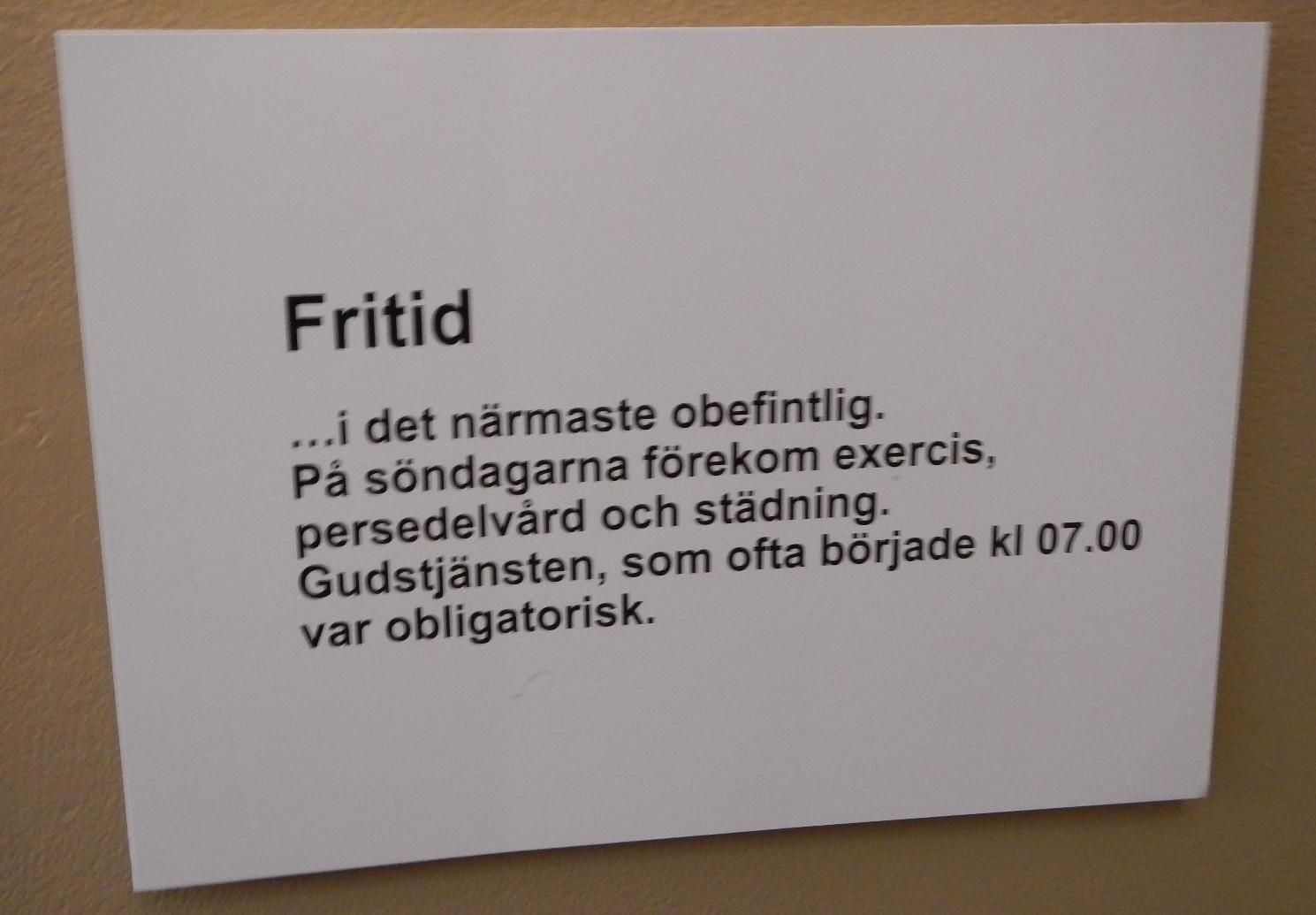 Naturligtvis fanns det även fritid, på söndagarna mellan gudstjänsten, exercis, persedelvård och städning. Eftersom gudstjänsten började kl. 07.00 kan vi utesluta sovmorgon. Undrar varför de kallade det fritid? Tack och lov för att arbetsvillkoren har förändrats det här skulle aldrig fungerat idag.