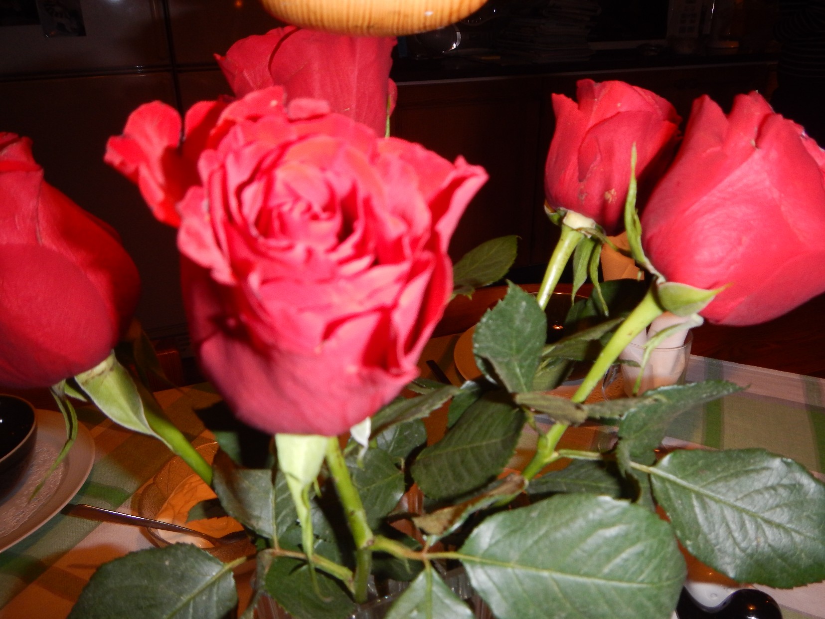 Det är alltid gott med mat och i synnerhet i trevligt sällskap. Eftersom Rolf inte har varit så pigg ett tag blir det så att man sitter hemma en hel del och då är man glad att det finns goda vänner. Sådana som spontan bjuder till, de är värda en eloge och kanske en ros som de på fotot här. Blir dessutom billigt för mig att utdela då det är grannfruns blommor på deras 44:e bröllopsdag, nu får de glädja fler.
