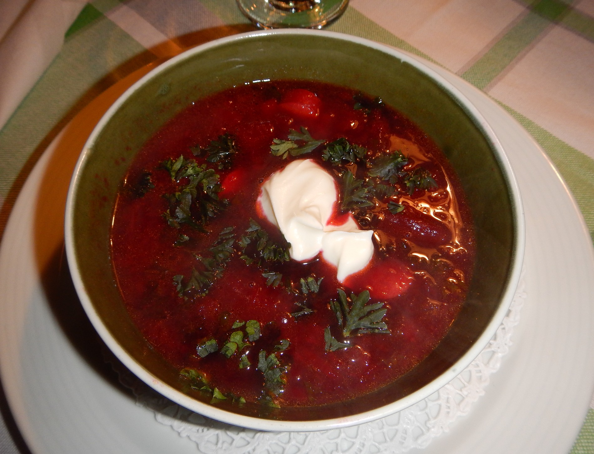 Idag på morgonen ringde telefonen för att fråga om vi ville komma på lunch till våra grannar. Ja det var inte telefonen som ringde utan grannarna. Det bjöds på en kraftig och smakrik Rödbetssoppa eller Borsjtj som det också kallas. Visst ser den härlig ut med den kraftigt röda färgen och den gröna persiljan.