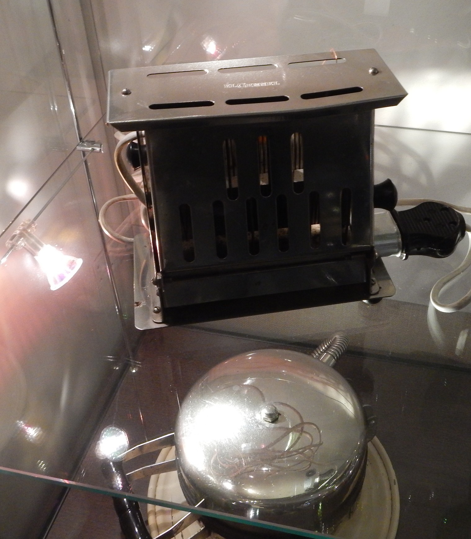 Moderna brödrostar i rostfritt och klumpiga våffeljärn, rejäla och slitstarka saker. Ja det var tider det. Då fanns det inga stora varhus att gå till och frossa i den nyaste tekniken. Men det var en kul idé att spränga in den här utställningen mitt i all försvarshistoria.