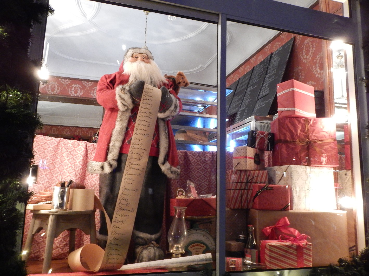 I fönstret bredvid står Santa själv och studerar en önskelista. Har en svag känsla av att min årliga önskan om en marsipangris inte blir uppfylld i år. Rolf brukar annars träda in i tomtens ställe och levererar den. Vissa år har jag fått två då sonhustrun har gett mig en gris i form av adventskalender, det var en lång mager stackare som dessvärre inte gjorde mig så värst mager.