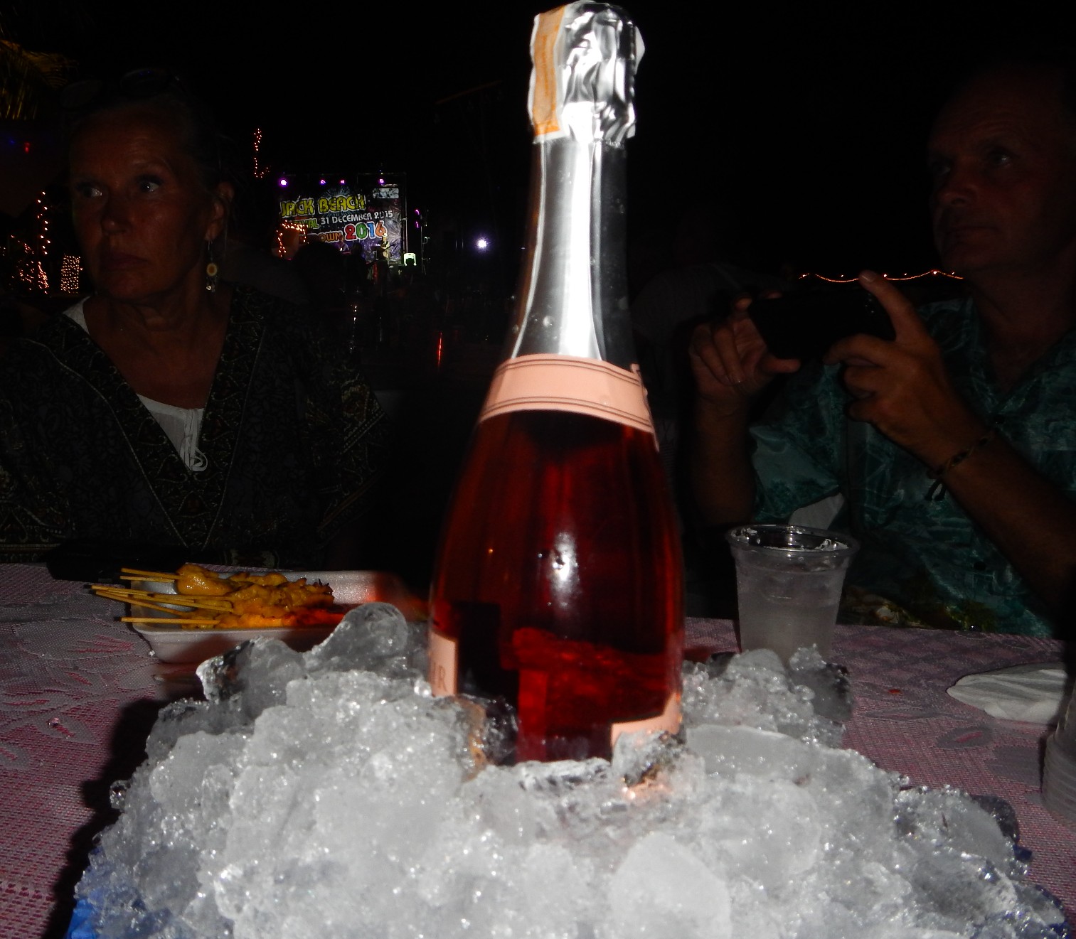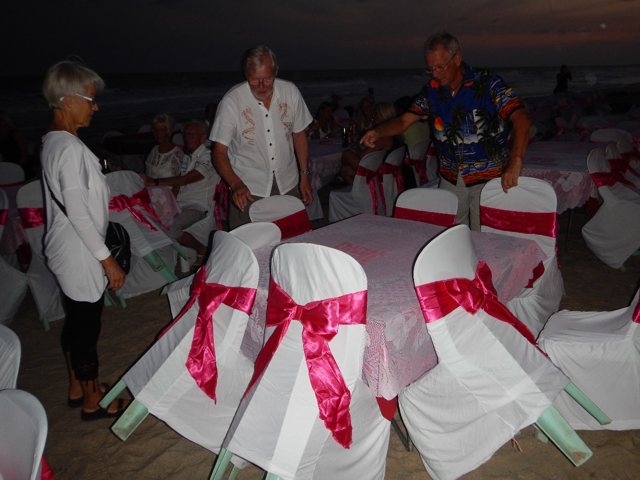 En mycket kort beskrivning av hur vi firade vår nyårsafton, kan ju inte skriva om allt det är trist nog att läsa det som blir. Men för oss som var med var det väldigt stämningsfullt. Vi firade kvällen på Jacks vilket är en restaurang som ligger direkt vid stranden i Huay Yang, det var vi och cirka 200 personer till. När vi kom dit fick vi gå igenom en ”gång” som var vackert ljussatt dessutom var det lampor överallt i träden som lyste så vackert i den becksvarta natten. Här nedan har vi hittat vårt bord och är i färd med att sätta oss.