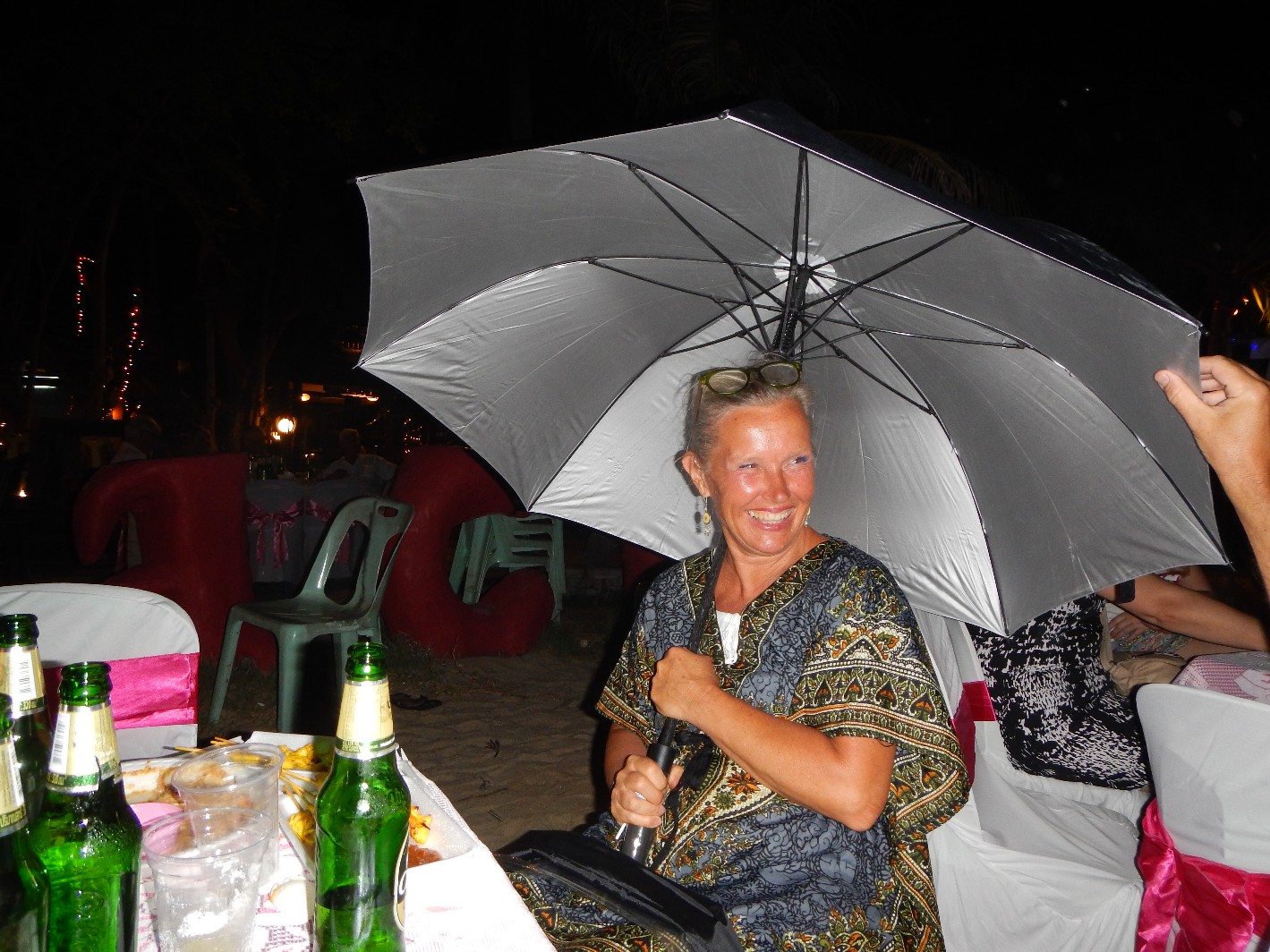 Det fanns ett träd där det hängde gratislotter och här nedan var det en vid bordet som gladde sig åt vinsten, ett golfparaply. Maten vilken bestod av en thailändsk buffé var mycket god och logistiken kring det hela fungerade perfekt och trots att vi var så många blev det inga köer.