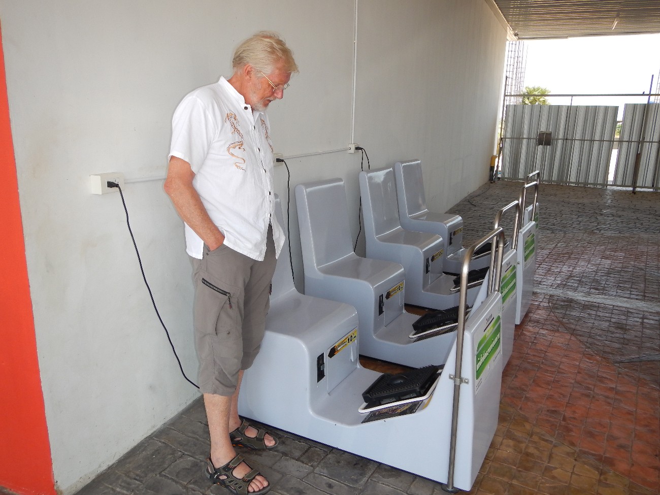 Ett toalettbesök brukar alltid stå överst på programmet och här finns en plats som har typiskt thailändska toaletter men även ett par av europeisk standard. Män till vänster och kvinnor till höger, på fotot ser man att det även står en våg placerad kanske till för den som vill väga sig före och efter toalettbesök?