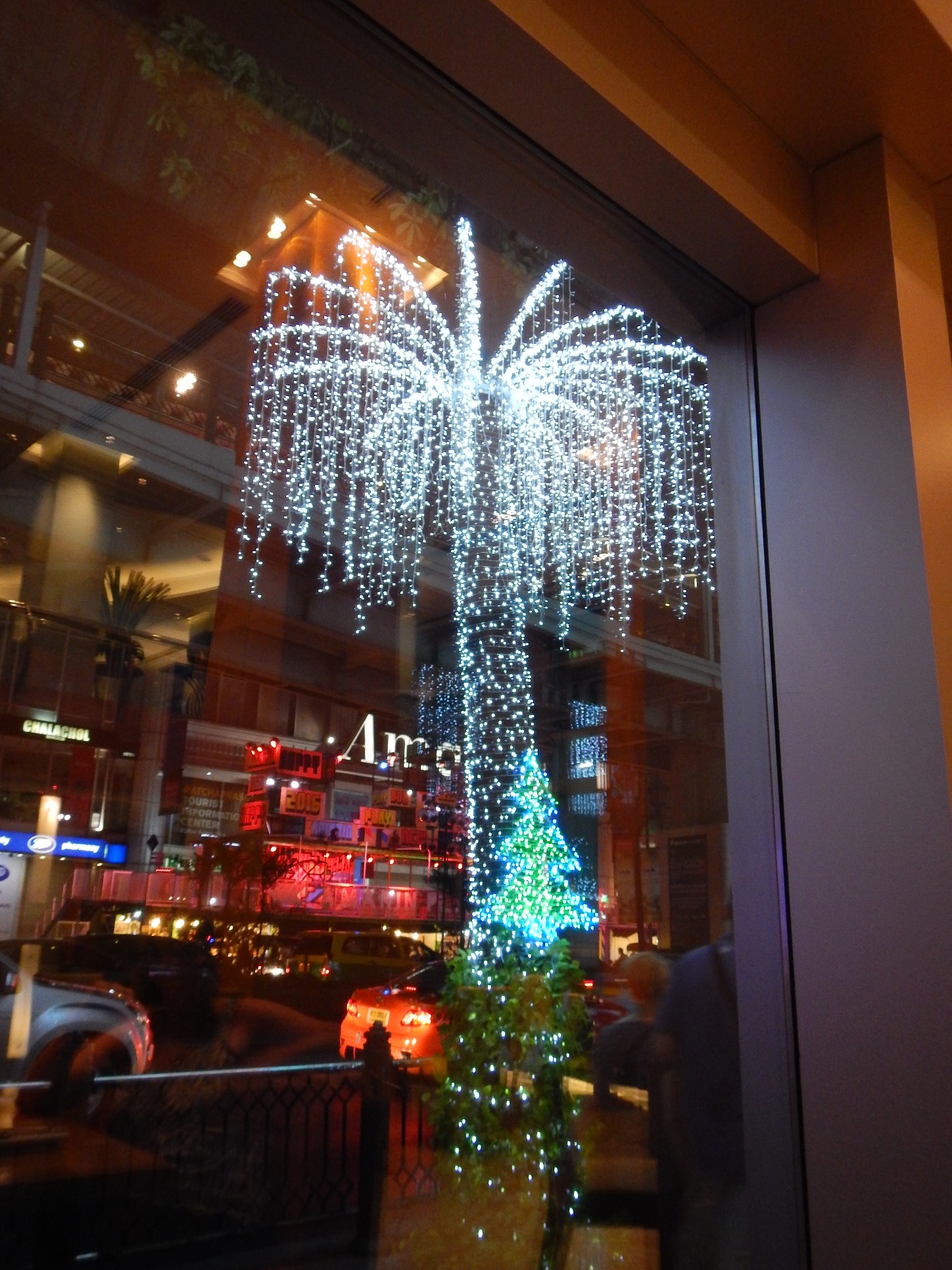 Dagen efter såg vi, det var lampor fastsatta på vanliga palmer och mitt på stammen var de kostgjorda palmbladen. högt ovanför var den riktiga trädkronan men den syntes inte i mörkret.