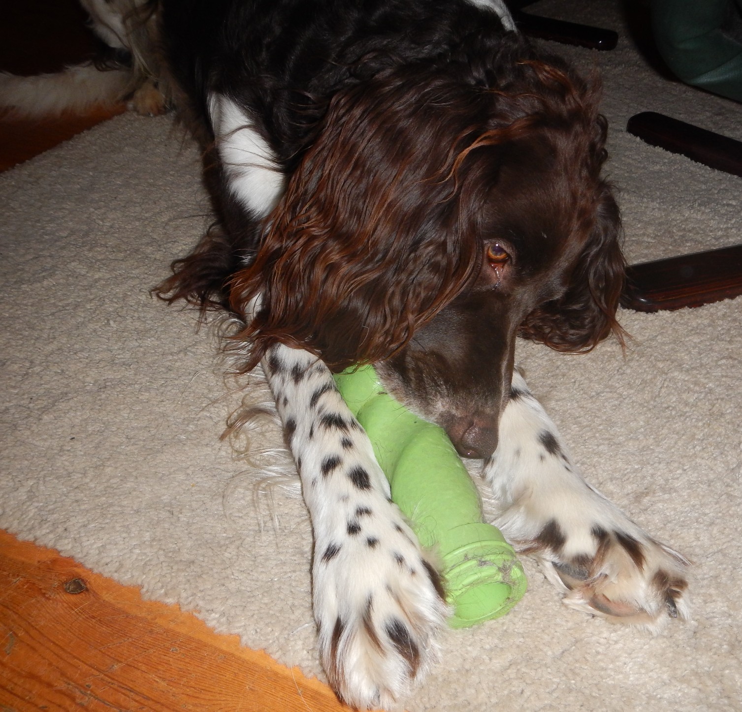 När nyheterna börjar på TV då vill han ha ”godis” i sin gröna plastleksak och detta upprepas två gånger. Nu vet jag att hundar kan räkna för efter två gånger ger han upp.