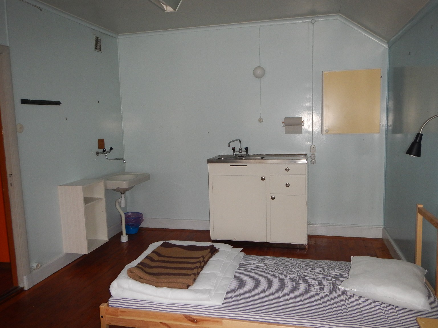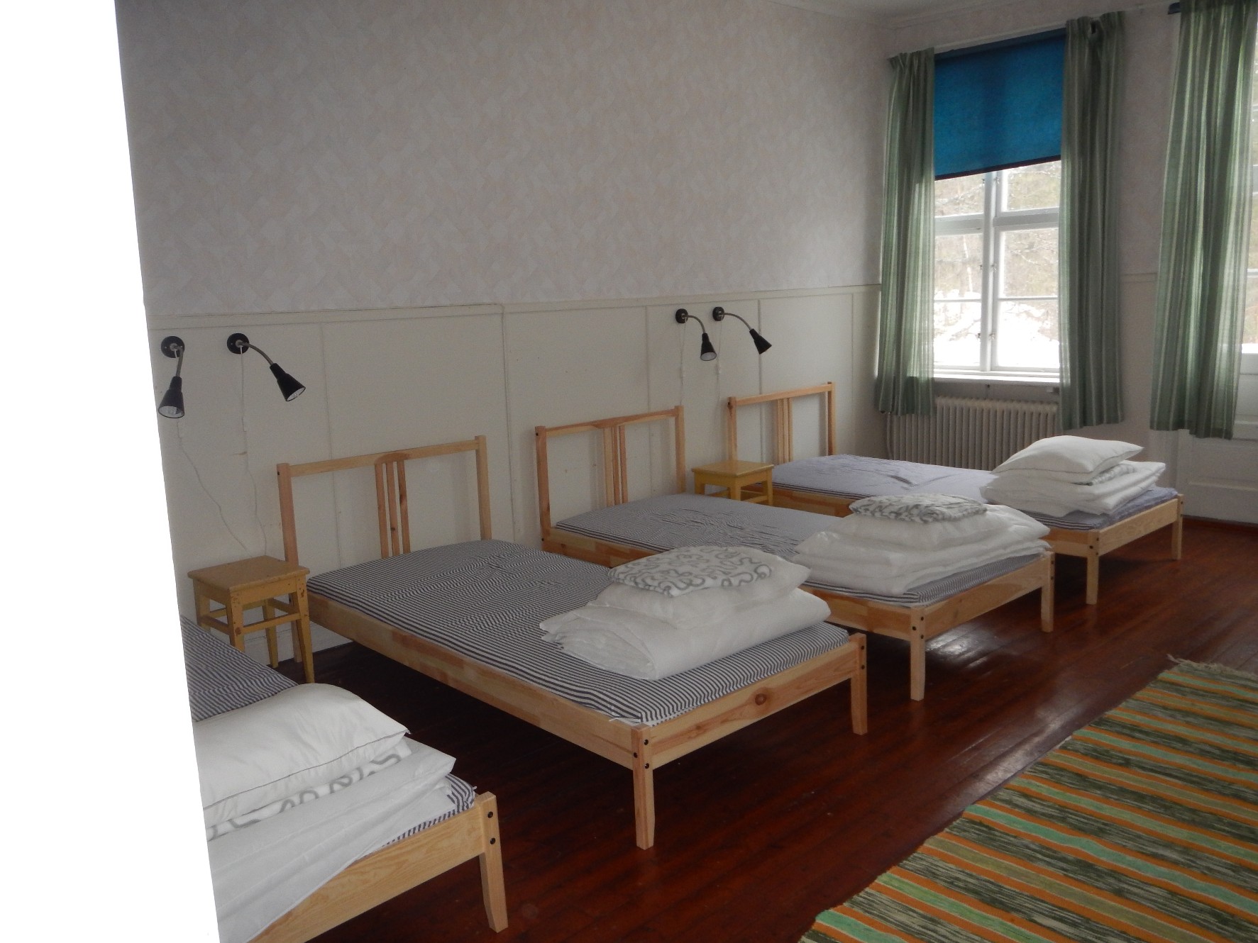 Jag började med att titta in i några rum. Här fick det plats 4-6 sängar beroende på hur tätt de stod. De här sängarna är nya så vem vet, kanske var det våningssängar?