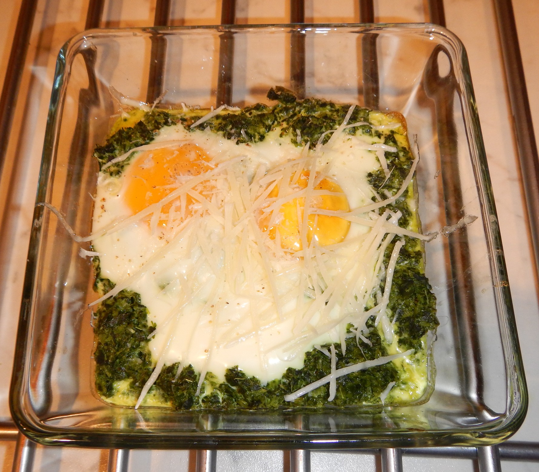 Serverade en rätt som var enkel att göra, stekte grönkål i stekpannan, kryddade samt smaksatte med lite creme fraiche. Ner i portionsformar knäck över ägg och lite riven parmesan. In i ugnen 175 grader i 15 minuter.