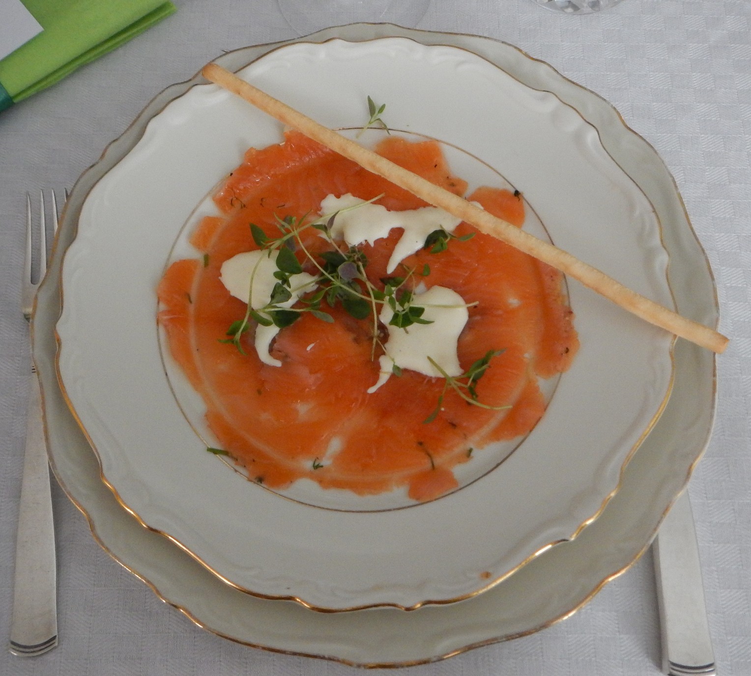 Därefter en entrérätt på laxcarpaccio med senapsdressing.