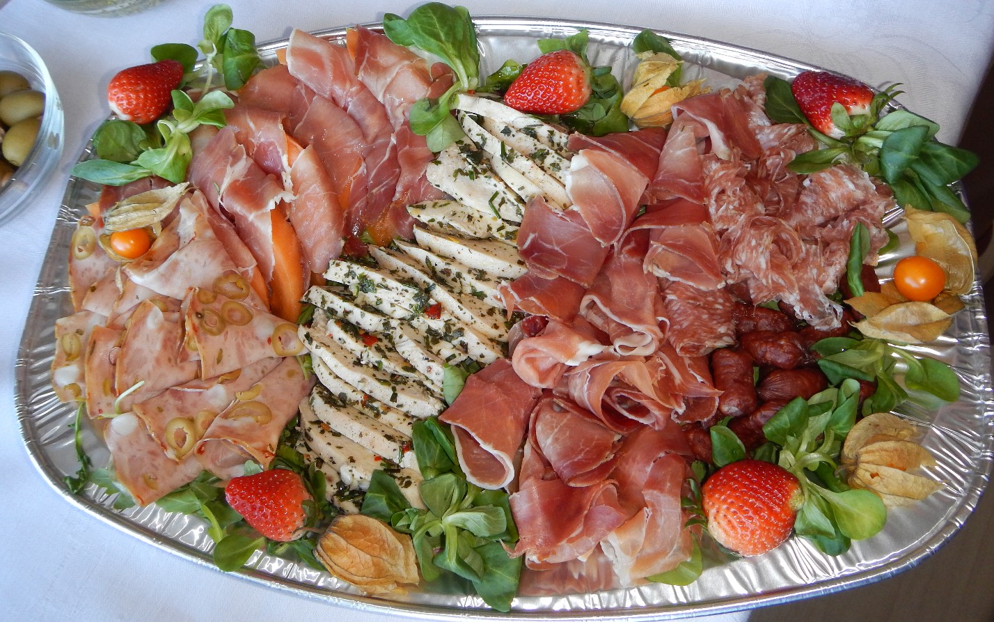 Huvudrätten var en platta med ,parmaskinka, mortadella, salami, marinerad kyckling med mera. Pestopastasallad och en tomat och mozzarellasallad.