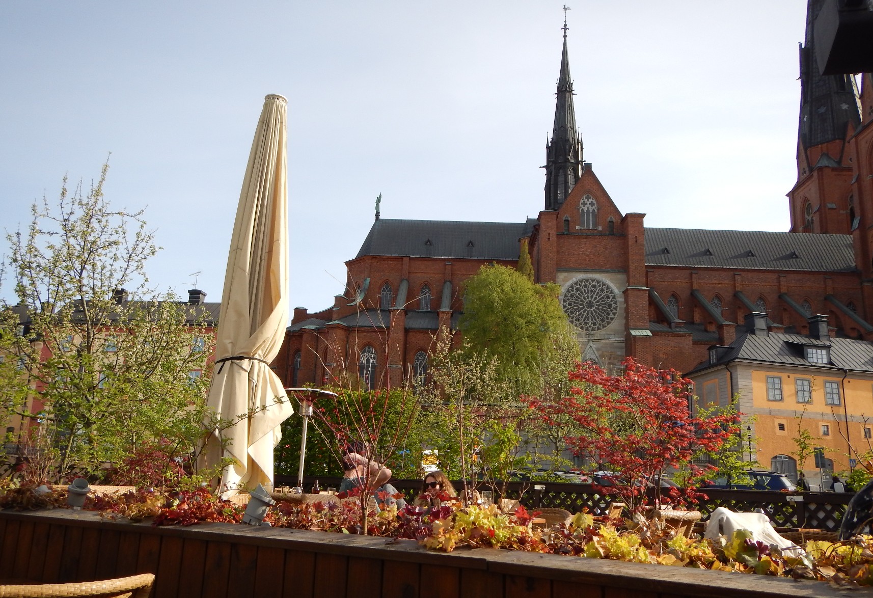 Årets första middag på en utomhusrestaurang har jag för egen del inmundigat ikväll med hjälp av infravärme och filtar var det riktigt behagligt. Valde grillad lax, jag blev antagligen inspirerad att välja det eftersom jag tittat på Asptrappan (en anläggning som möjliggör för fisk att ta sig förbi ett vandringshinder) precis innan. Förutom god mat och trevligt sällskap av ”gamla” kollegor hade jag även en fin utsikt från min stol, Uppsala domkyrka som invigdes 1435. Har väl glatt åtskilliga med sin vackra skapelse sedan dess kan jag tro. Eftersom den är 118,7 meter lång och lika hög i de båda tornen hade jag vissa svårigheter att få med hela kyrkan på bild, där jag satt.