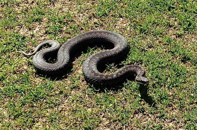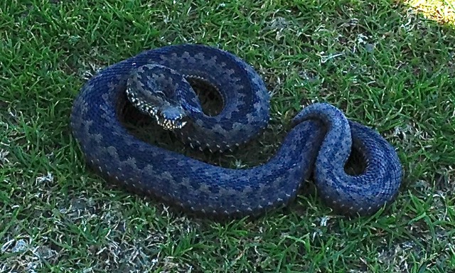 Den här krabaten mötte ett par goda vänner till oss mitt på banan när de var ute och spelade en dag nyligen. Inte var han rädd heller, nej han låg nöjt på sin plats och tittade på när de slog sina slag. De var tvungna att gå runt den för att kunna fortsätta spela. Tjurig var han också, beredd att gå till anfall, fast det skulle inte jag ha sett om jag spelat eftersom jag redan varit avsvimmad då.