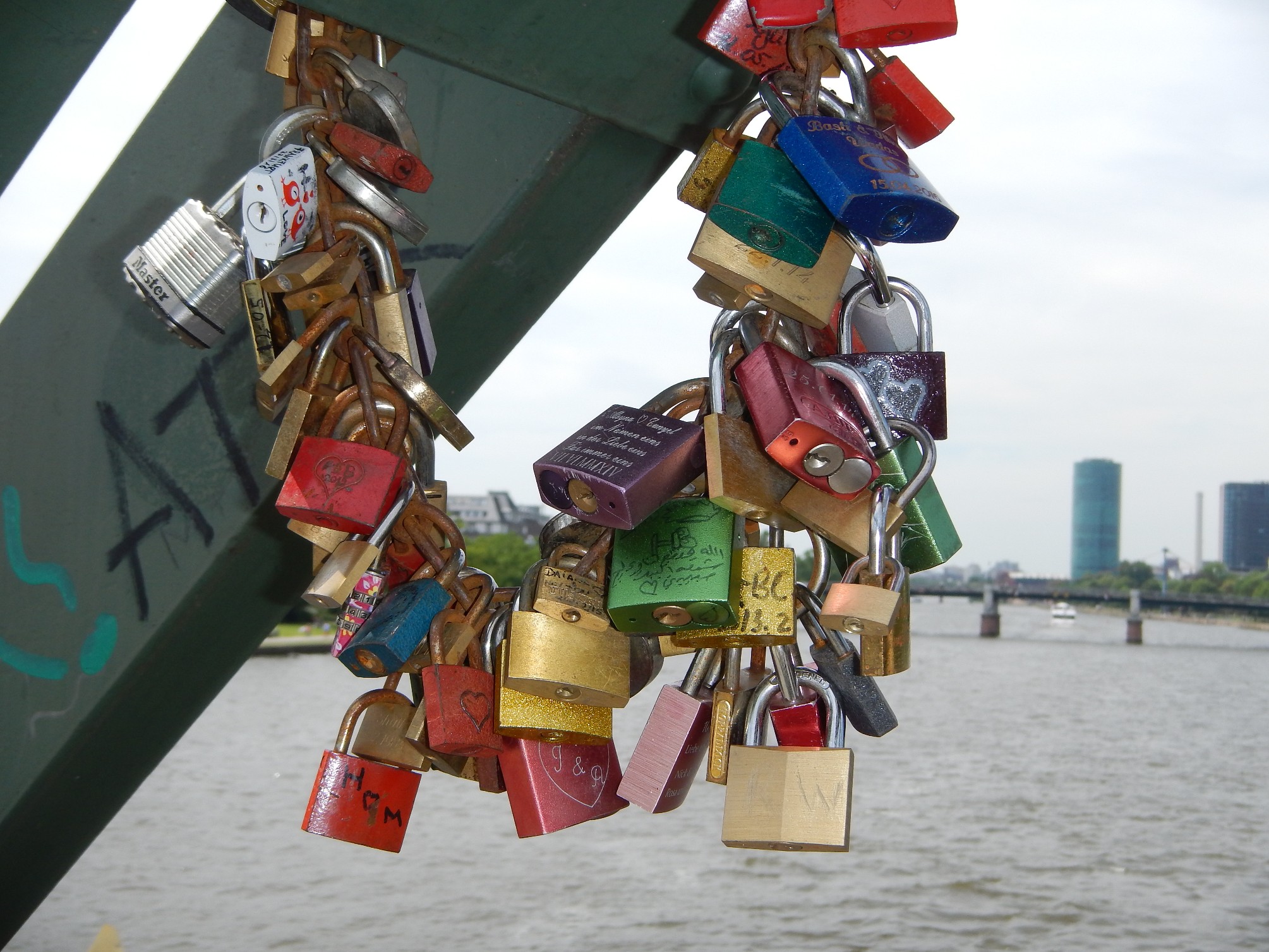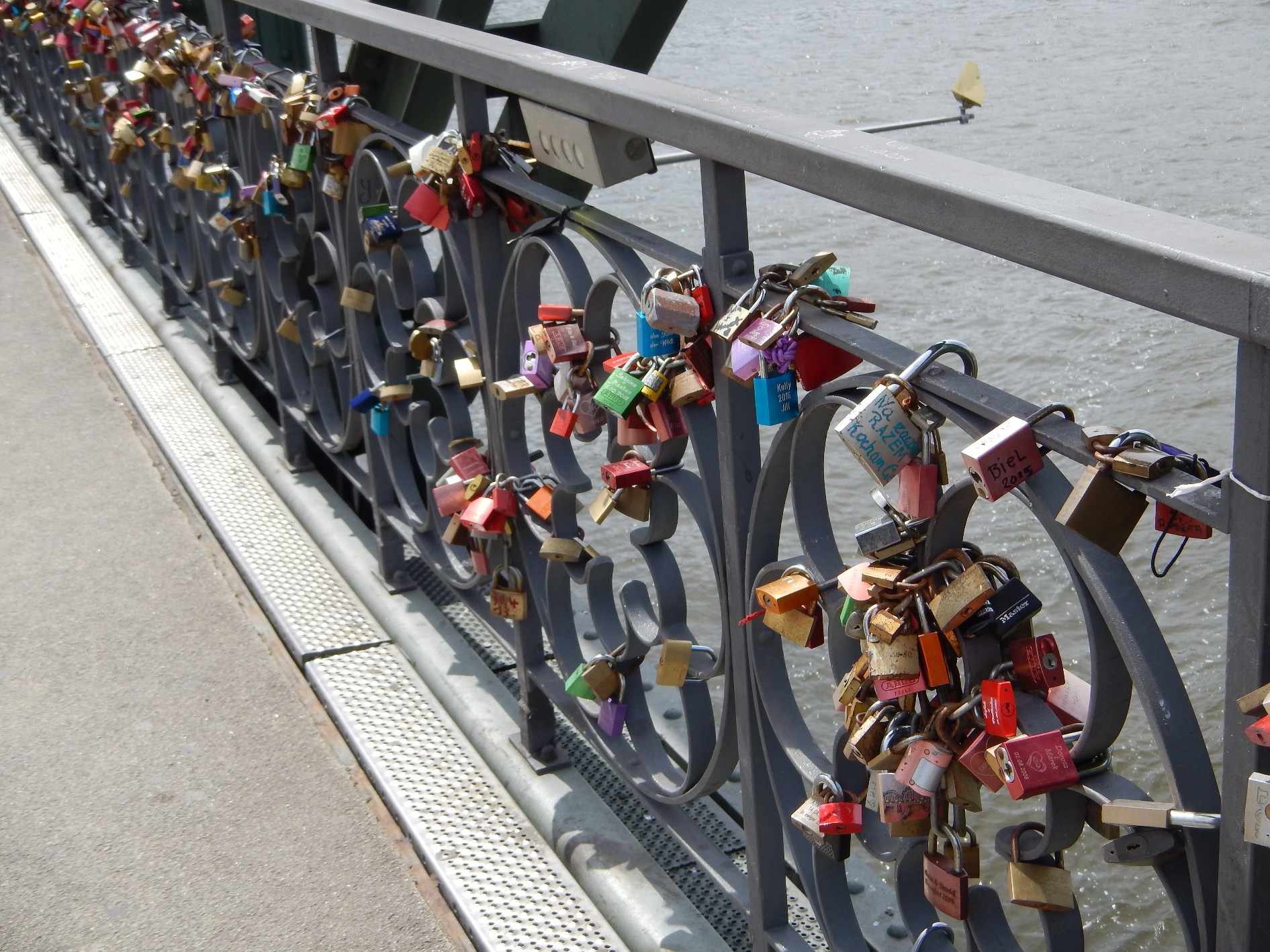 Vi beslöt oss att gå över den gamla järnbron (Eiserner Steg) som är en gångbro byggd 1869. Där har man en fantastisk utsikt över floden Main och Frankfurts Skyline, bron är 170 meter lång. Sprängdes faktiskt under de sista dagarna av andra världskriget men byggdes upp igen efter krigsslutet. Den här bron kopplar samman de centrala delarna av staden med Sachsenhausen. När man går över bron kan man inte undgå att se alla förälskelselåsen, här sätter förälskade par upp ett hänglås på broräcket ofta med namn och årtal inristade. Antagligen symboliserar det en ”evig kärlek”. Om det inte funkar, ja då kanske de kommer tillbaka och låser upp det om de inte slängt nyckeln i floden.