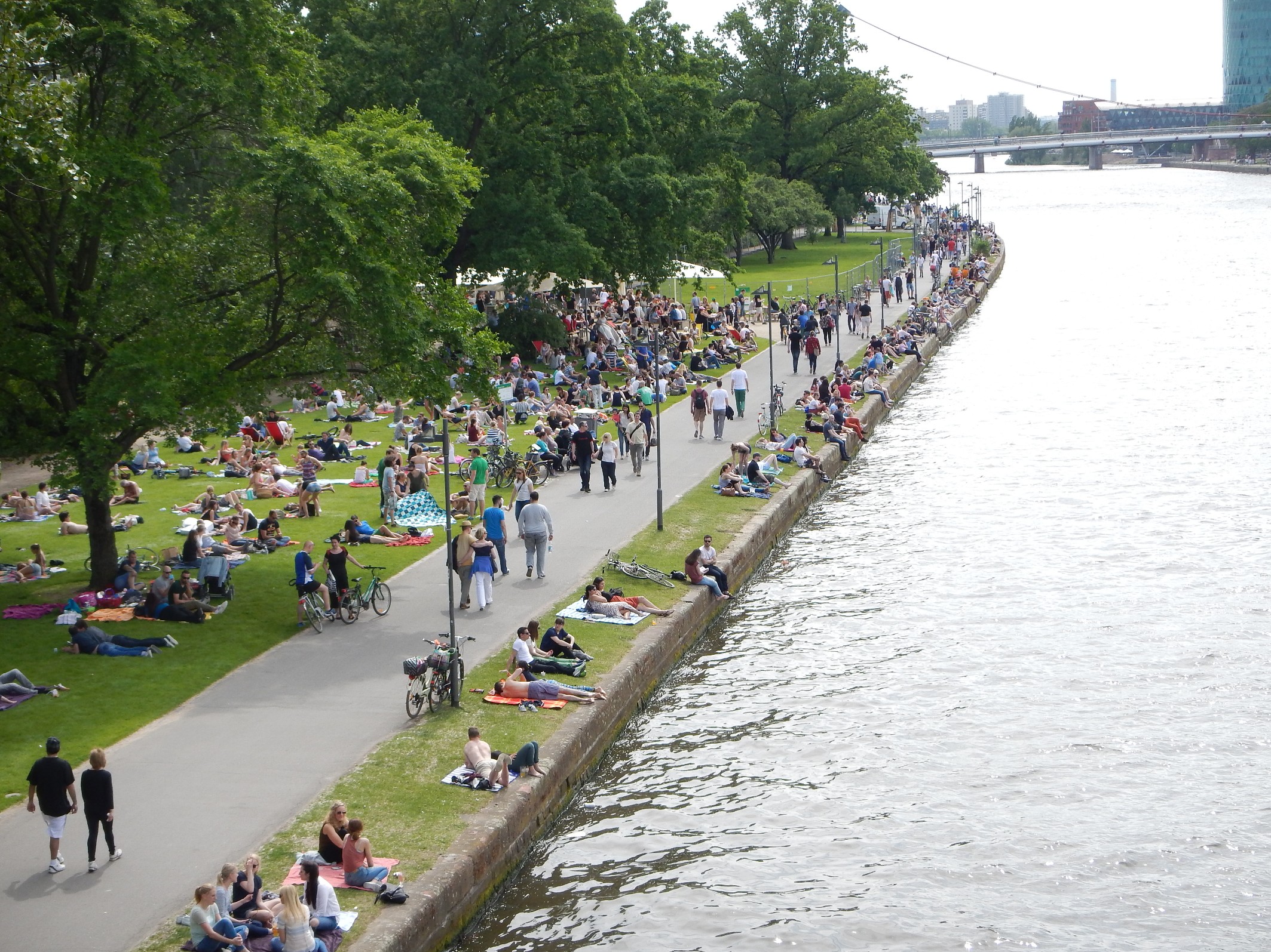 En varm, skön, solig dag och man befinner sig i Frankfurt, vad gör man då? Självklart tar man en promenad efter floden Main. Det är där som många Frankfurtbor tar chansen att njuta av sin lediga dag.