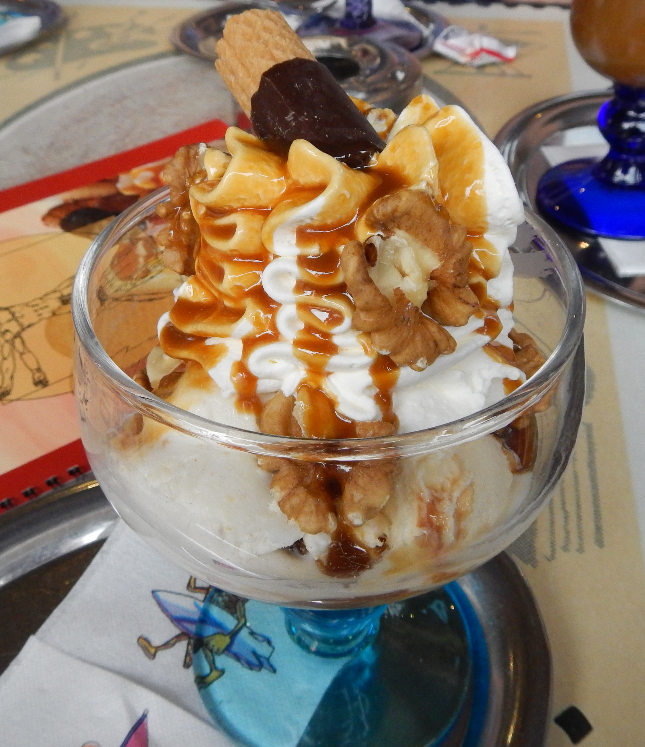 Vad vi fick in var isade jordgubbar i rieslingvin, något besvikna men det vägdes upp av en fantastiskt rolig och pratsam servitör. Man kan inte få allt. Efter dessa lite oväntade smakupplevelser tog vi det säkra före det osäkra, gick över bron igen för att sätta oss och njuta av en riktigt smaskig valnötsglass med kolasås. Vad är det man brukar säga, man ska inte gå över ån efter vatten.