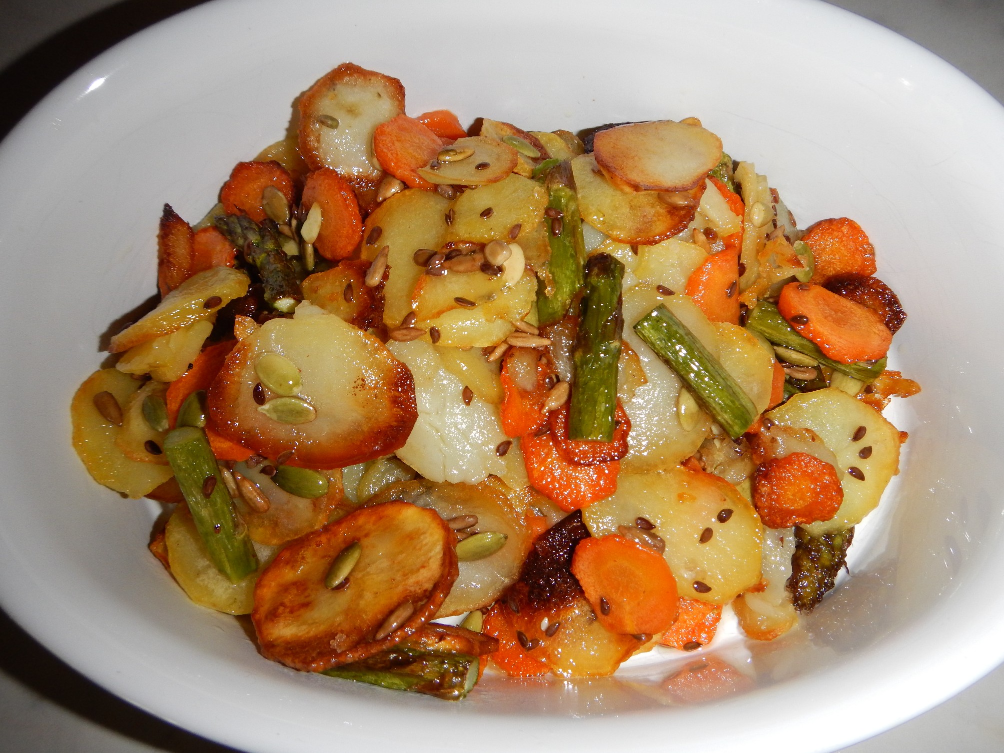 1 kg potatis i tunna skivor, 2 stora morötter i 5-6 mm tjocka skivor, 1 bunt grön sparris i stora bitar. Lägg det hela i en bunke och häll på 2,5 matskedar rapsolja, vänd runt och häll sedan ut det på en bakplåt. Strö över 2 matskedar flingsalt. In i ugnen 20 minuter i 250 graders värme. Rör runt det en gång. Tag ut plåten och häll över blandningen nedan.