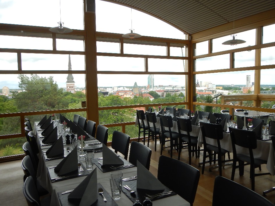Här kan man sitta utomhus och se ut över nejden med en kall öl i handen eller besöker man restaurangen en trappa upp. Ljus öppen lokal, de stora fönsterrutorna ger en fantastisk utsikt över Västerås. Rolf kunde här beskåda sin gamla skola lite grand från ovan. Modern inredning och stilsäkra möbler i harmoni med dukningen fullbordar det hela.