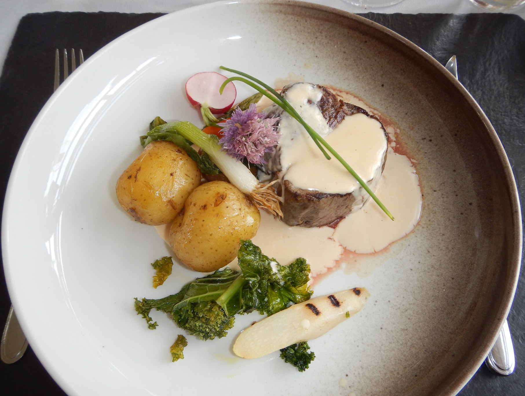 Varmrätt, Svensk premium oxfilè med rökt smörsås, säsongens primörer samt confiterad delikatesspotatis. Om jag är rätt uppdaterad så är confiterad potatis kokt i smör, olja och lite brynt efter det, recepten är dock många och olika så hur just dessa är tillagade kan jag inte säga. För första gången åt jag en gräslöksblomma som inte bara var vacker utan smakade helt OK. Lätt friterad grönkål och lite harsyra samt att salladslöken hade rötterna på förgyllde det hela. Smörsåsen hade en lätt rökt smak, ovanligt men väldigt gott till den möra oxfilén