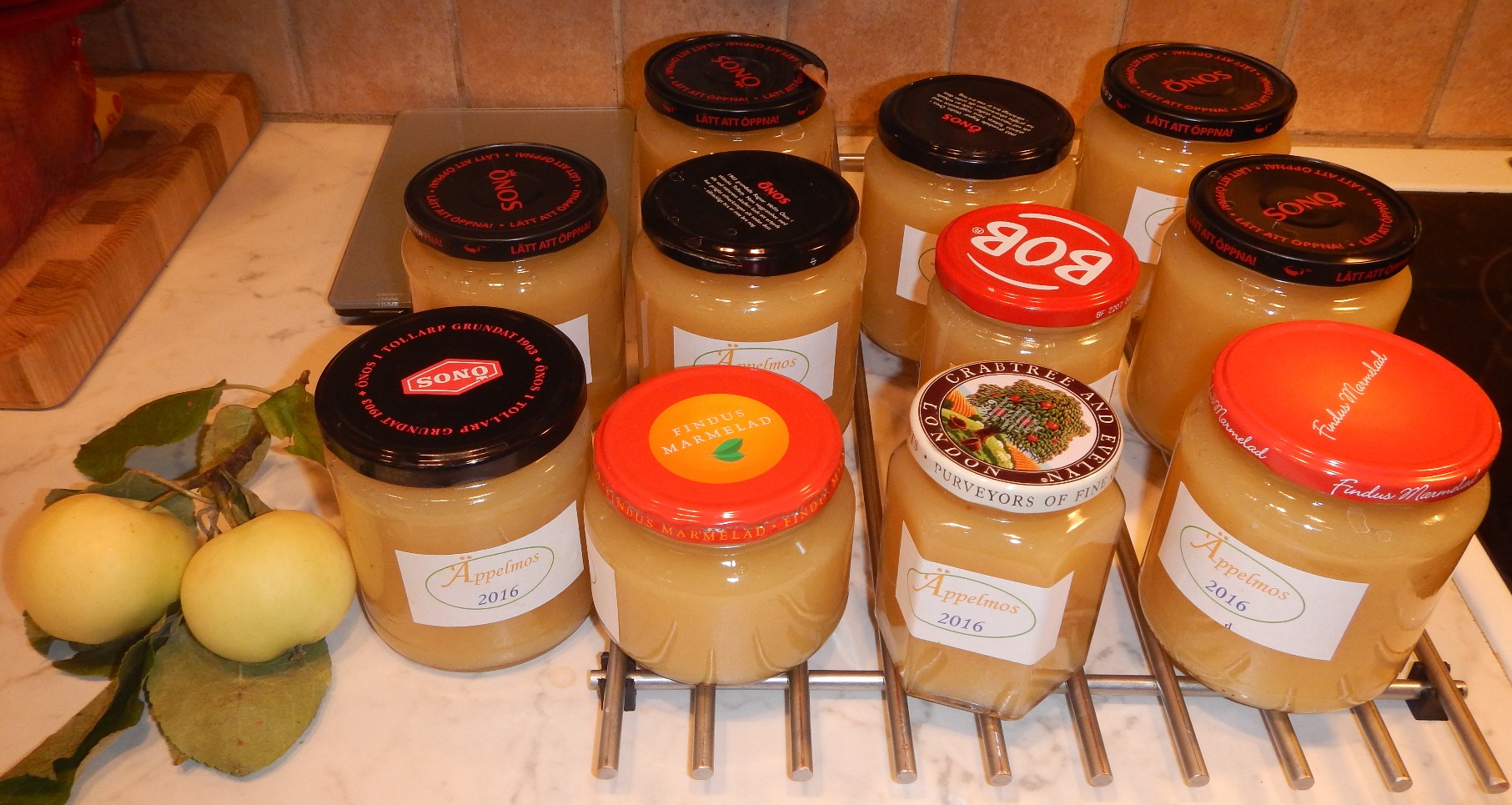 Smörgåsen var god och de färska räkorna var fräscha men hur kan det komma sig att det luktar räkor i kylskåpet i flera dagar efteråt? Lördagen gick åt till en massa praktiska saker och söndagen blev lite mer avslappnad. Tioåriga barnbarnet följde med hem och förgyllde vår dag, hjälpte mig att plocka lite äpplen. Dessa förvandlades därefter till mos, så med dem jag gjorde förra veckan bör det räcka under vintern.