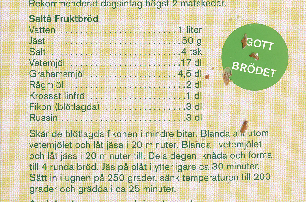 Fast i ärlighetens namn berättade han att receptet fanns på Saltå kvarns paket med krossade linfrön. På baksidan. Det rekommenderade dagsintaget gäller linfrö ej bröd om någon skulle missuppfatta.