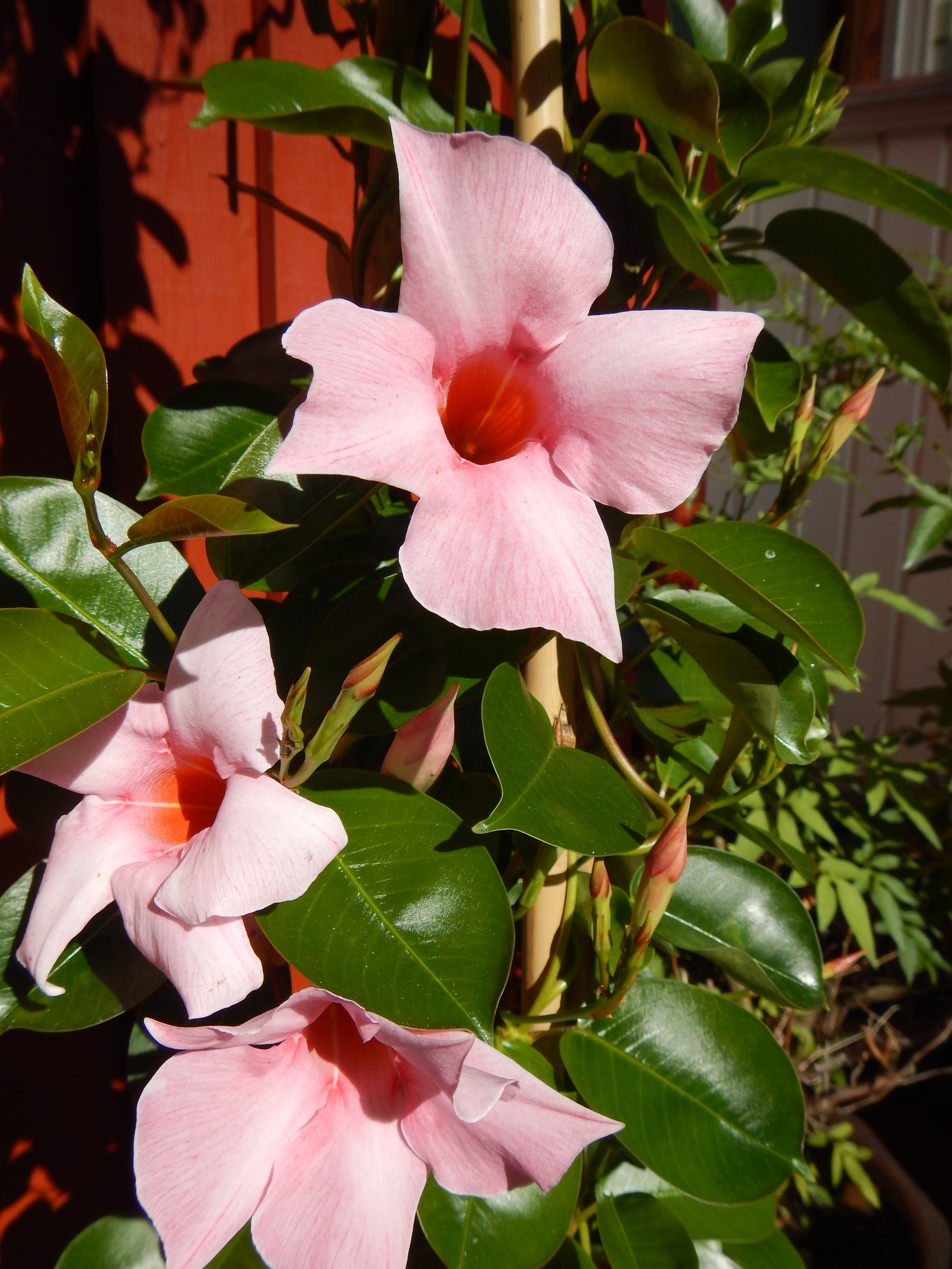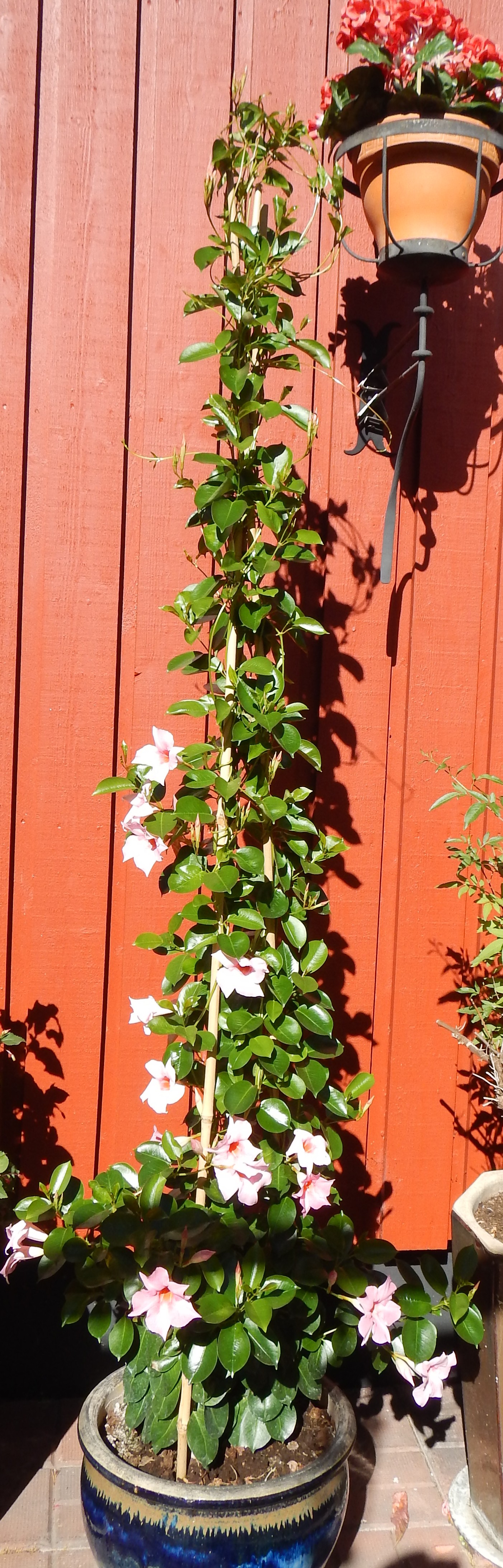 Då gäller det att lugna ner sig och tänka på något vackert, blommor till exempel. Den här Bägarrankan eller Dipladenia eller varför inte det vetenskapliga namnet Mandevilla. Den tillhör släkten Oleanderväxter och hos oss i Sverige är det egentligen en inomhusväxt. Den var planterad i en mindre kruka och några decimeter hög när Rolf fick den på sin födelsedag av goda vänner.