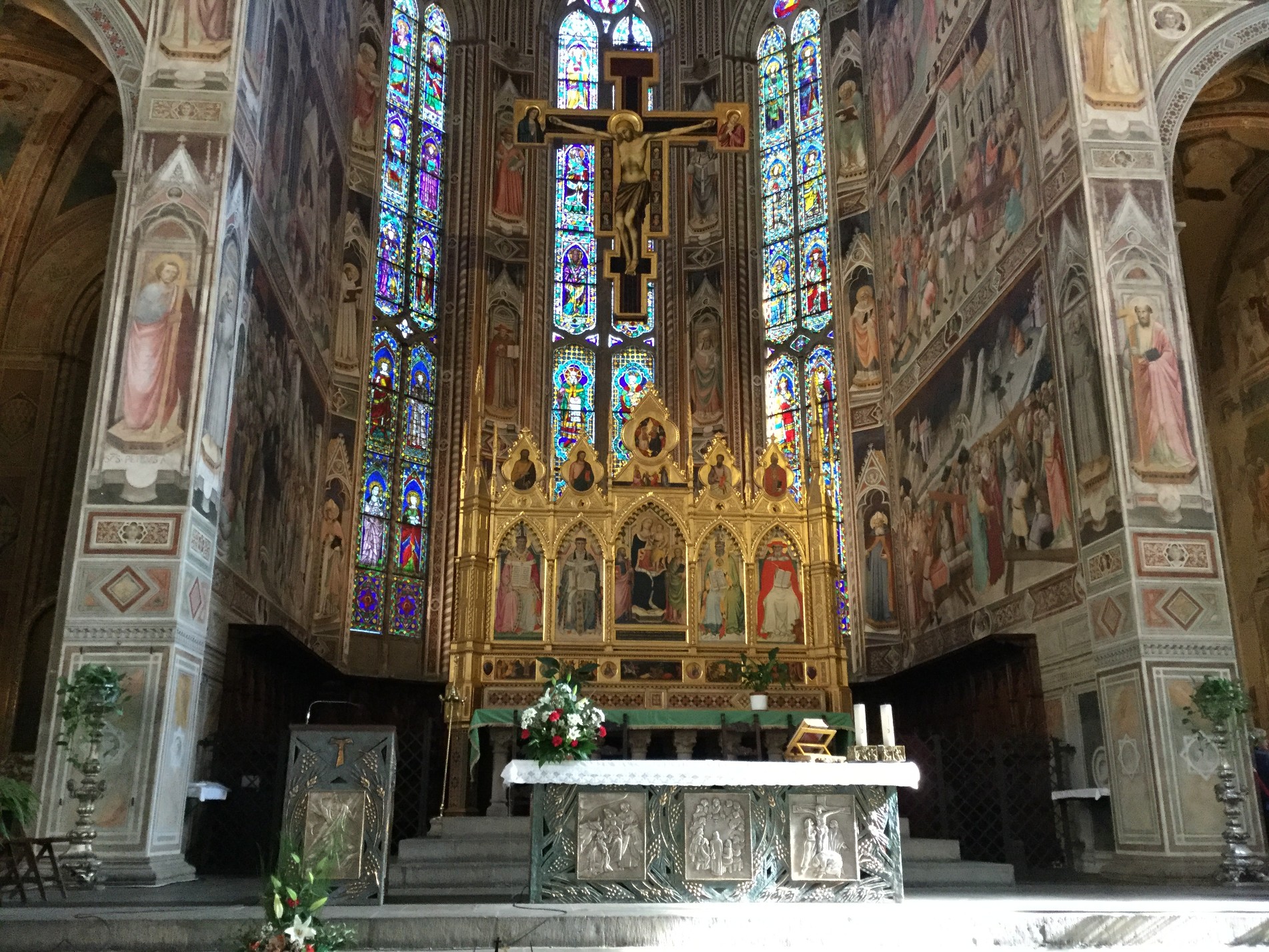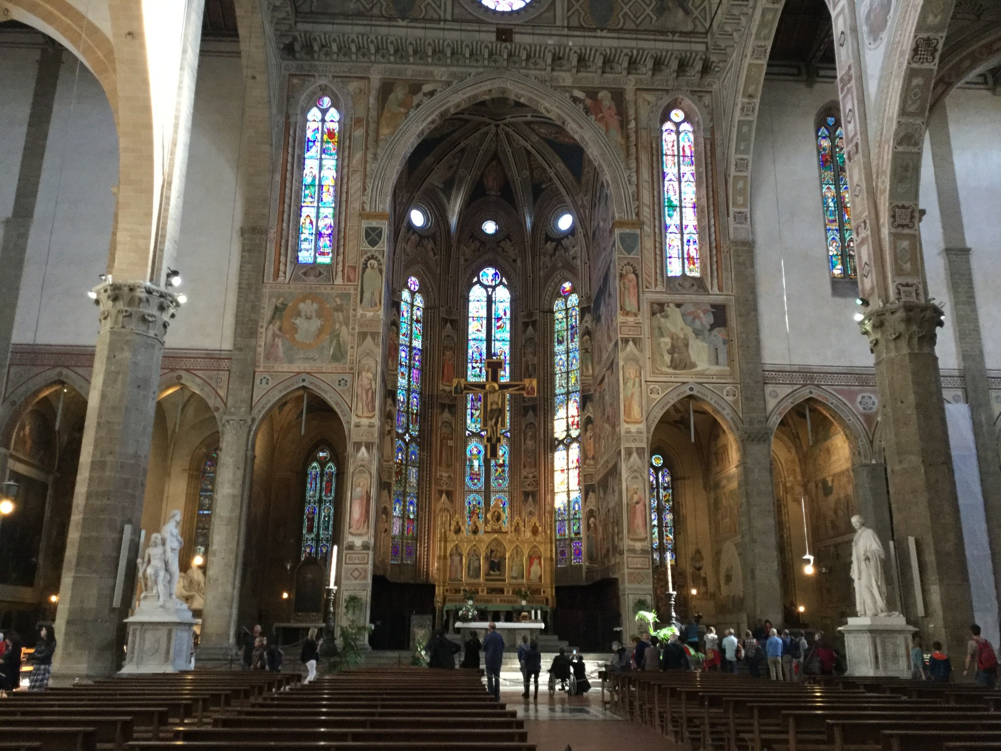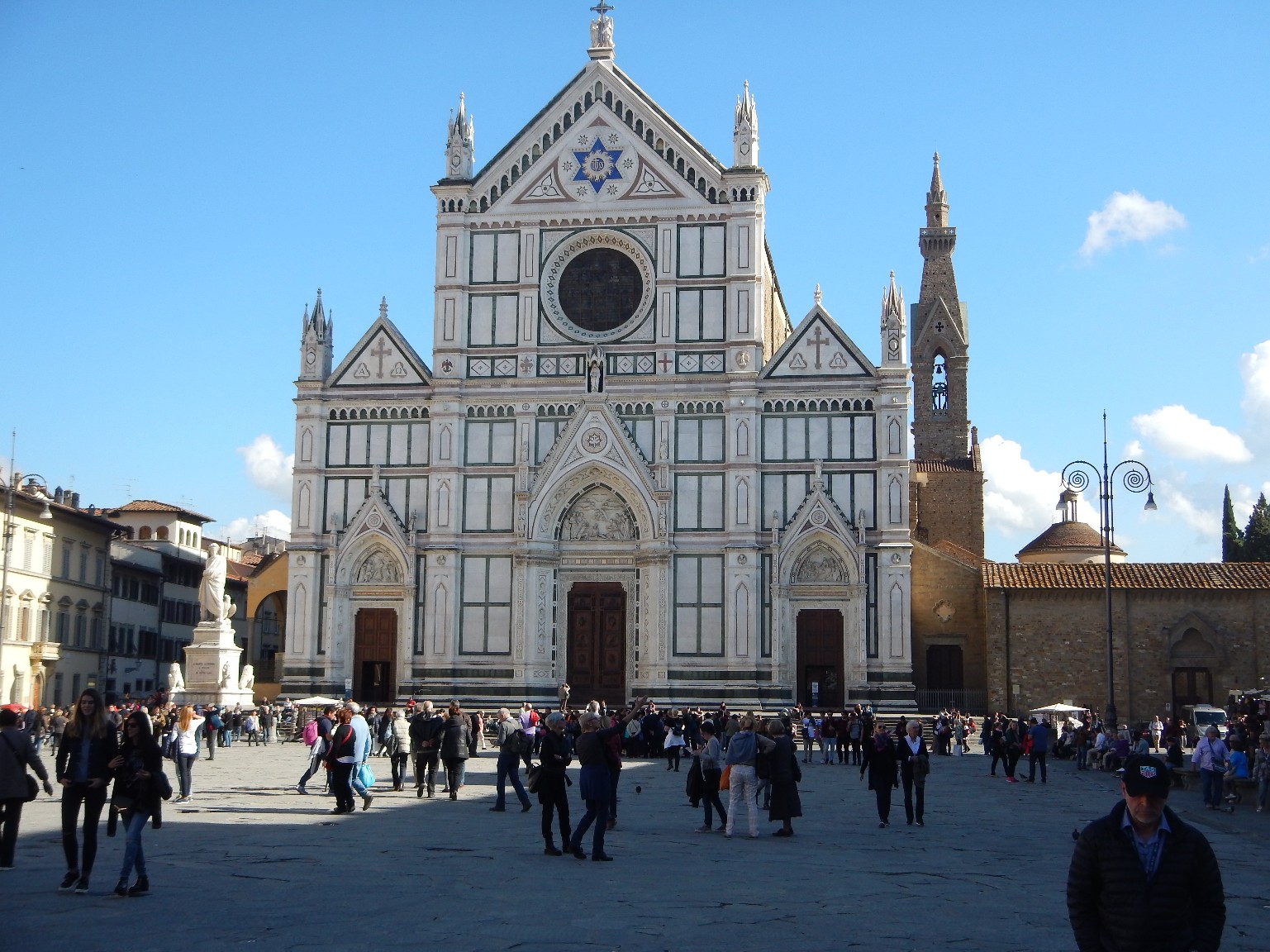 Basilica di Santa Croce i Florens eller Heliga korsets basilika som den ju också heter är franciskanernas huvudkyrka i Florens. Det sägs att det var Franciskus av Assisi som grundade kyrkan, men den nuvarande byggnaden påbörjades av Arnolfo di Cambio år 1294. Den ligger på Piazza Santa Croce och ser väl egentligen inte så mycket ut för världen, javisst är den vackert men jämfört med den stora katedralen är den intetsägande. Det kostade 4 euro i inträde, frågan är om det är värt att betala för. Där bedrar man sig, vilken kyrka, vilken historia och vilka konstskatter mer än väl värt pengarna. Detta är mer än en kyrka det är både kyrka och museum, ett stort konstmuseum. Vill man verkligen se allt ja då bör man ha minst ett par dagar. När vi var där var tyvärr den fantastiska trädgården stängd.