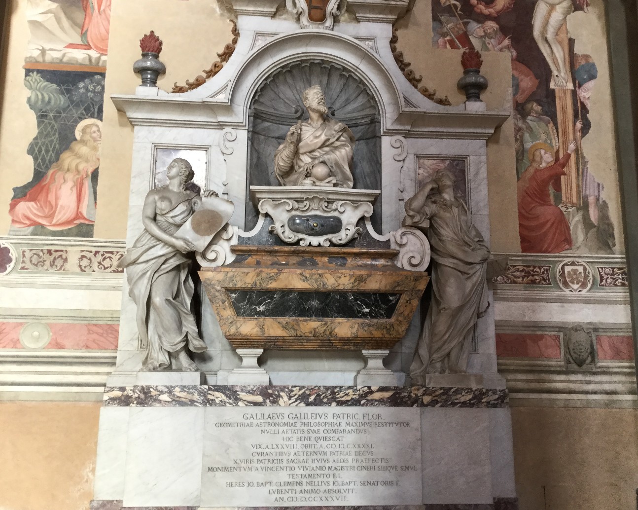 Galileo Galilei, född 1564 i Pisa, bodde i Florens och var son till en musiker. Han är alltså begravd i den här kyrkan. Galilei var italiensk vetenskapsman och många känner nog igen hans namn Man brukar säga att med honom grundlades den moderna naturvetenskapen.