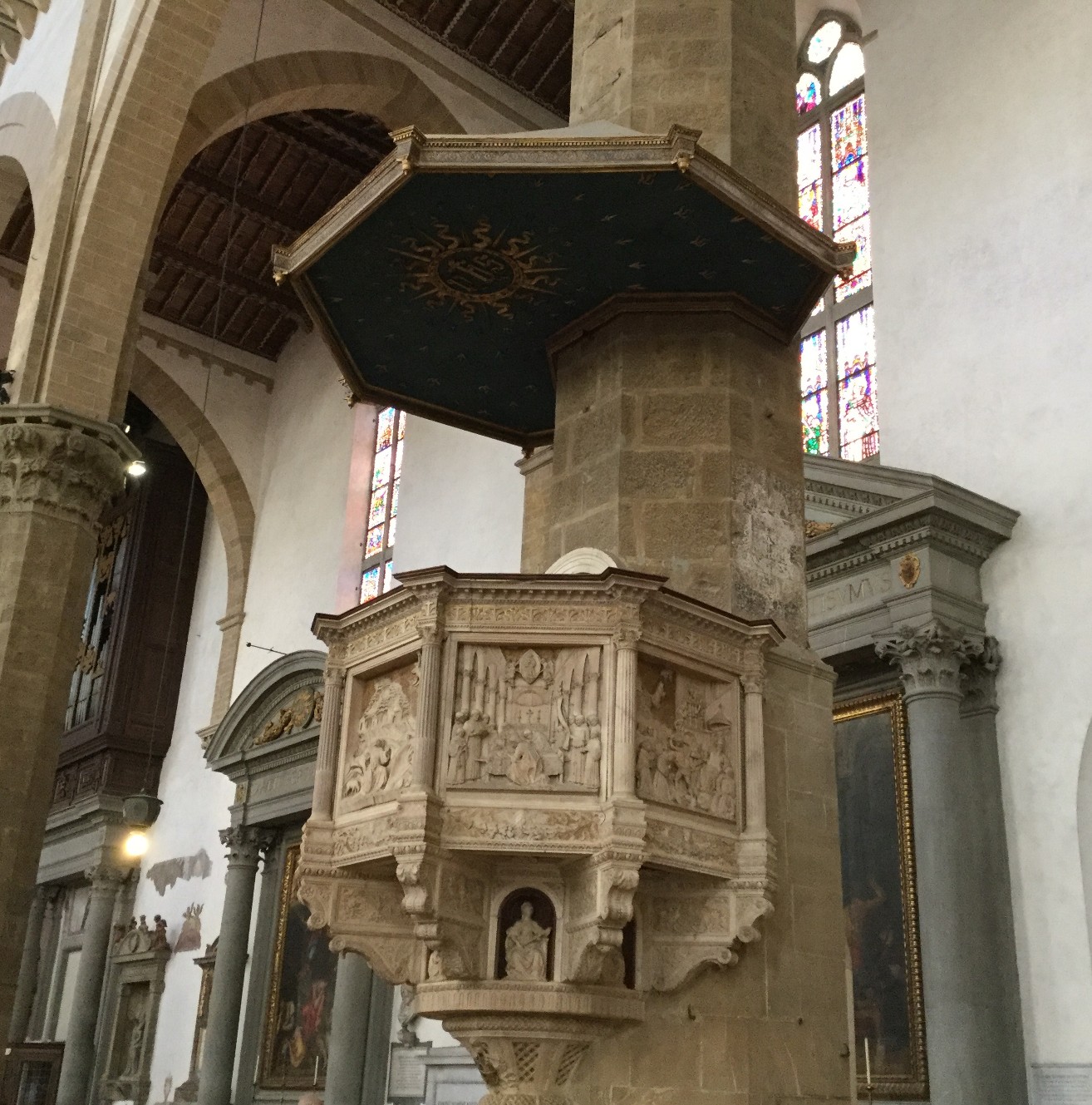 Ska man upp i den här predikstolen måste man gå i trappan som finns inuti pelaren, får bara hoppas att de har elektrisk belysning där. Inte roligt för en präst att falla.