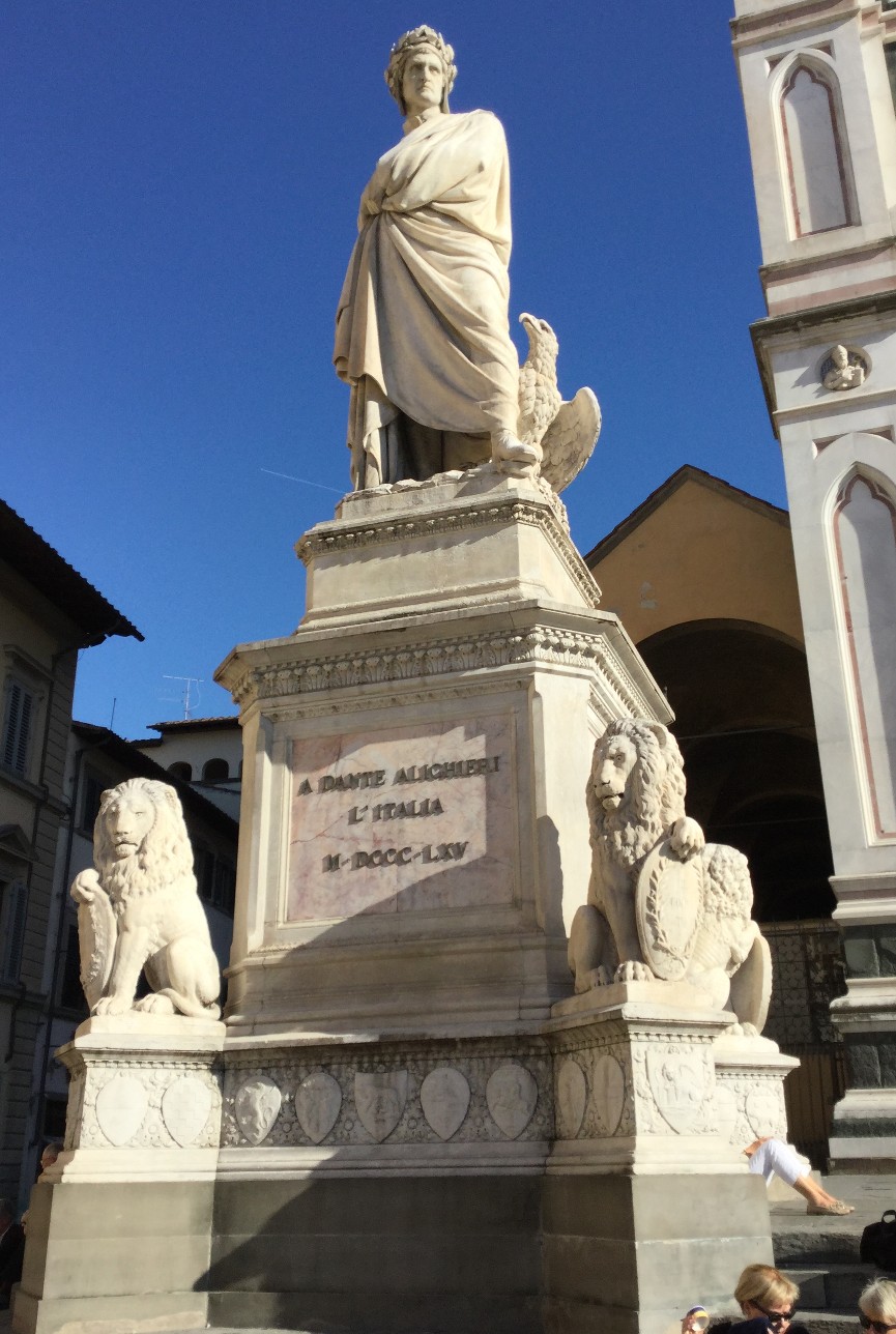 Michelangelo är även han begravd i den här kyrkan men jag tog inget foto av det. När jag är ute och reser besöker jag gärna kyrkor vilket kanske märks. Det finns så mycket historia att hämta och efter att ha sett allt i dem brukar jag läsa om det när jag kommer hem. På så sätt åker man två gånger. Av tidsbrist hann jag tyvärr inte se alla de konstskatter som fanns där. Skulpturen av Dante som står utanför kyrkan får avsluta dagens blogg.