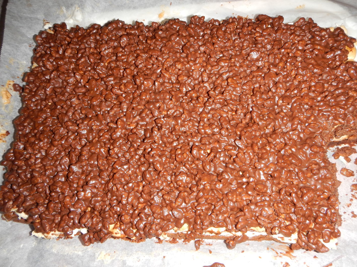 6. Chokladkrisp: Smält chokladen och smöret över ett vattenbad. Blanda i Rice krispies och rör om. Bred blandningen jämnt över den kalla kakan.