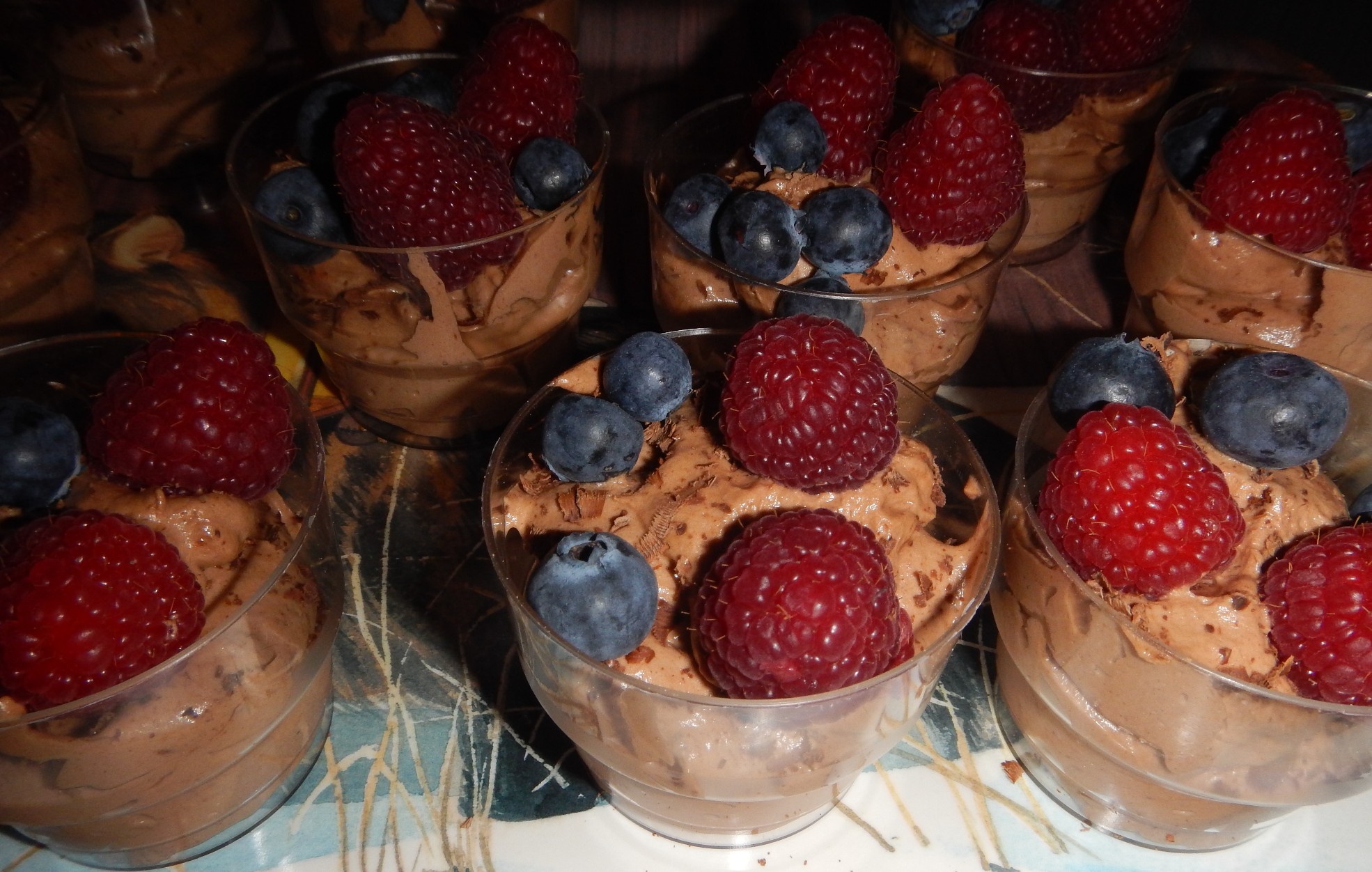 Ta och vispa 3 dl grädde ganska hårt och rör i 2 dl Nutella. Rör det till en jämn smet så det blandas helt. Lägg i glasen. Lägg gärna några färska bär på och strö över lite riven choklad alternativt finhacka mandel och rosta i en stekpanna och strö över.