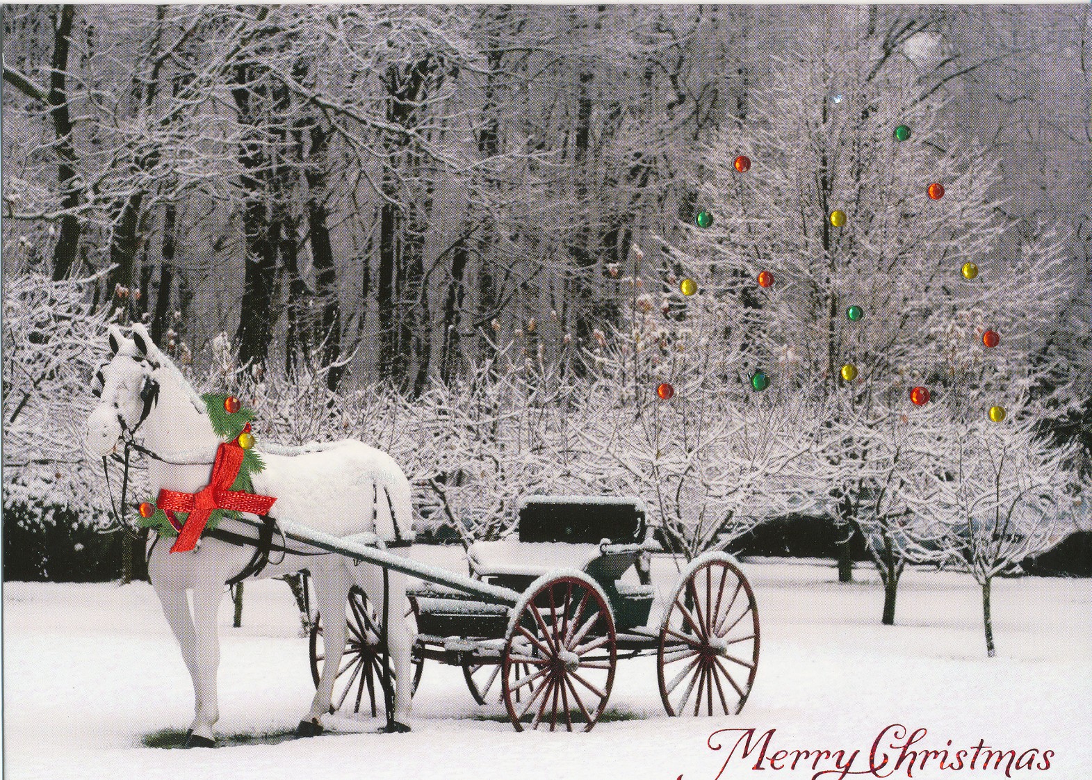 Men visst är det fint? Den snygga rosetten av sidenband på hästens hals, glittrande stenar på kransen och i träden antar att det är julgranskulor. En tur men den vagnen i den fina snön skulle jag inte tackat nej till. Ett annat kort som gladde oss mycket var detta.