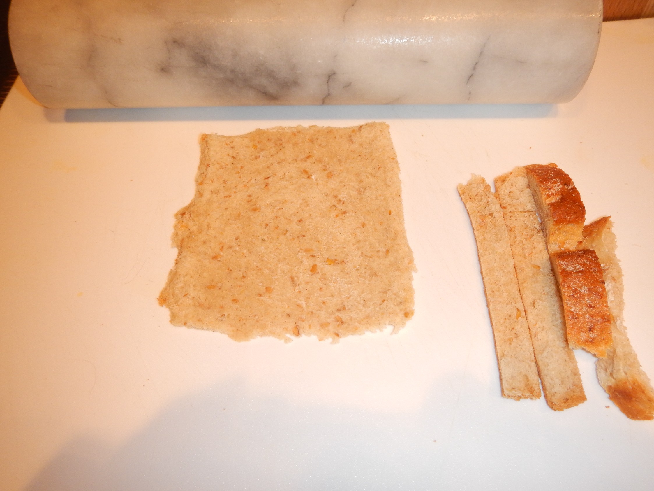 Ta en skiva rostbröd (jag hade bara surdegsbröd hemma) skär bort kanterna och kavla ut skivan mycket tunt.